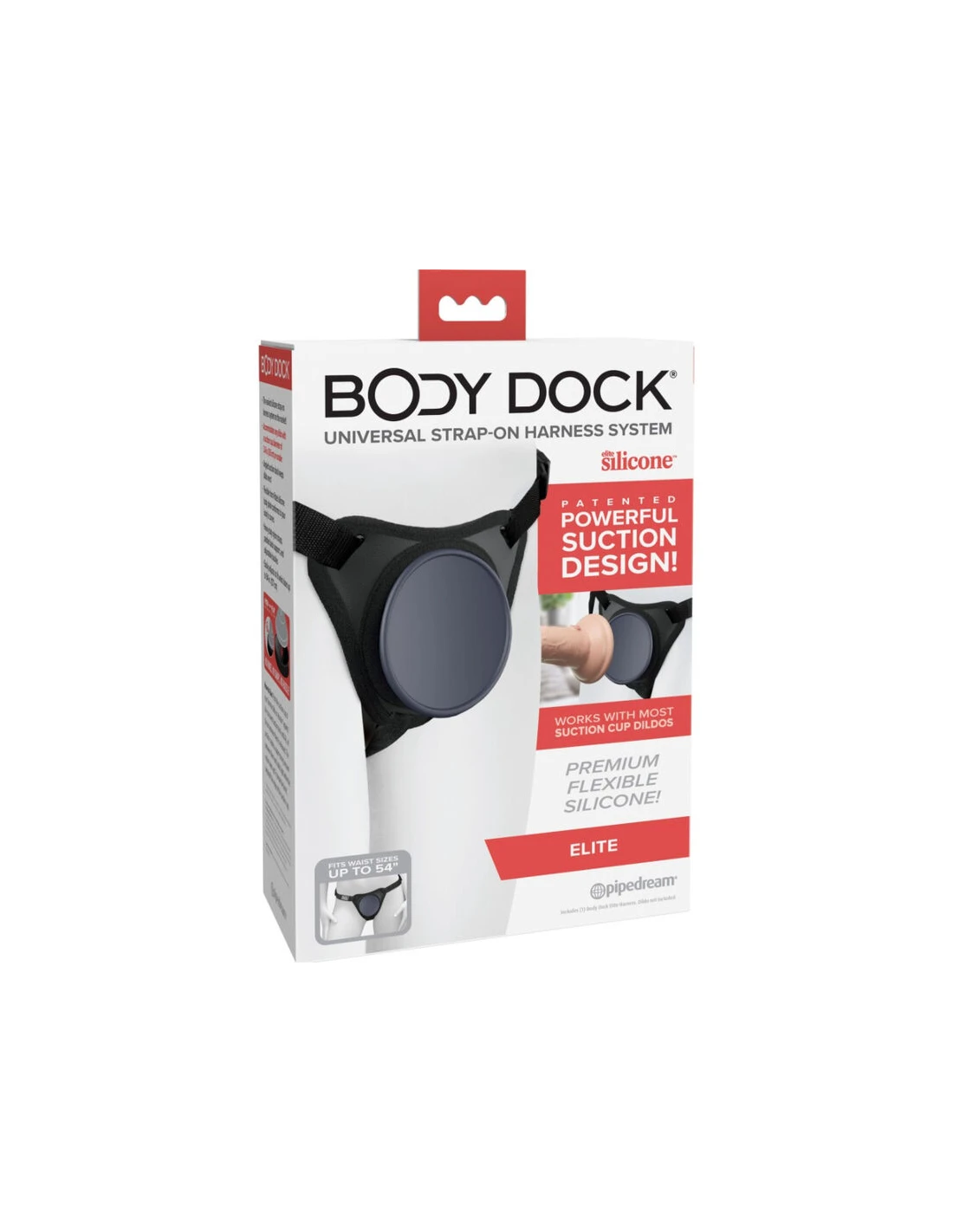 ¡El Body Dock Elite patentado lleva el juego con arnés a un nivel completamente nuevo! Cuenta con una placa de acoplamiento de silicona premium que se adapta a la forma de tu cuerpo para un ajuste óptimo. También incluye hebillas ajustables de liberación lateral y soporte acolchado para la espalda. ¡Cambiar tu accesorio favorito de arnés nunca ha sido tan rápido o fácil! Es tan simple como adjuntar la ventosa de tu dildo o vibrador favorito a la placa de acoplamiento, mientras que las correas de nylon se ajustan fácilmente a la mayoría de tallas y tipos de cuerpo. Y lo mejor de todo es que funciona con la mayoría de los dildos disponibles en el mercado hoy en día, incluidos algunos que ya puedas tener. ¡Sin anillos. Sin broches. Sin complicaciones!