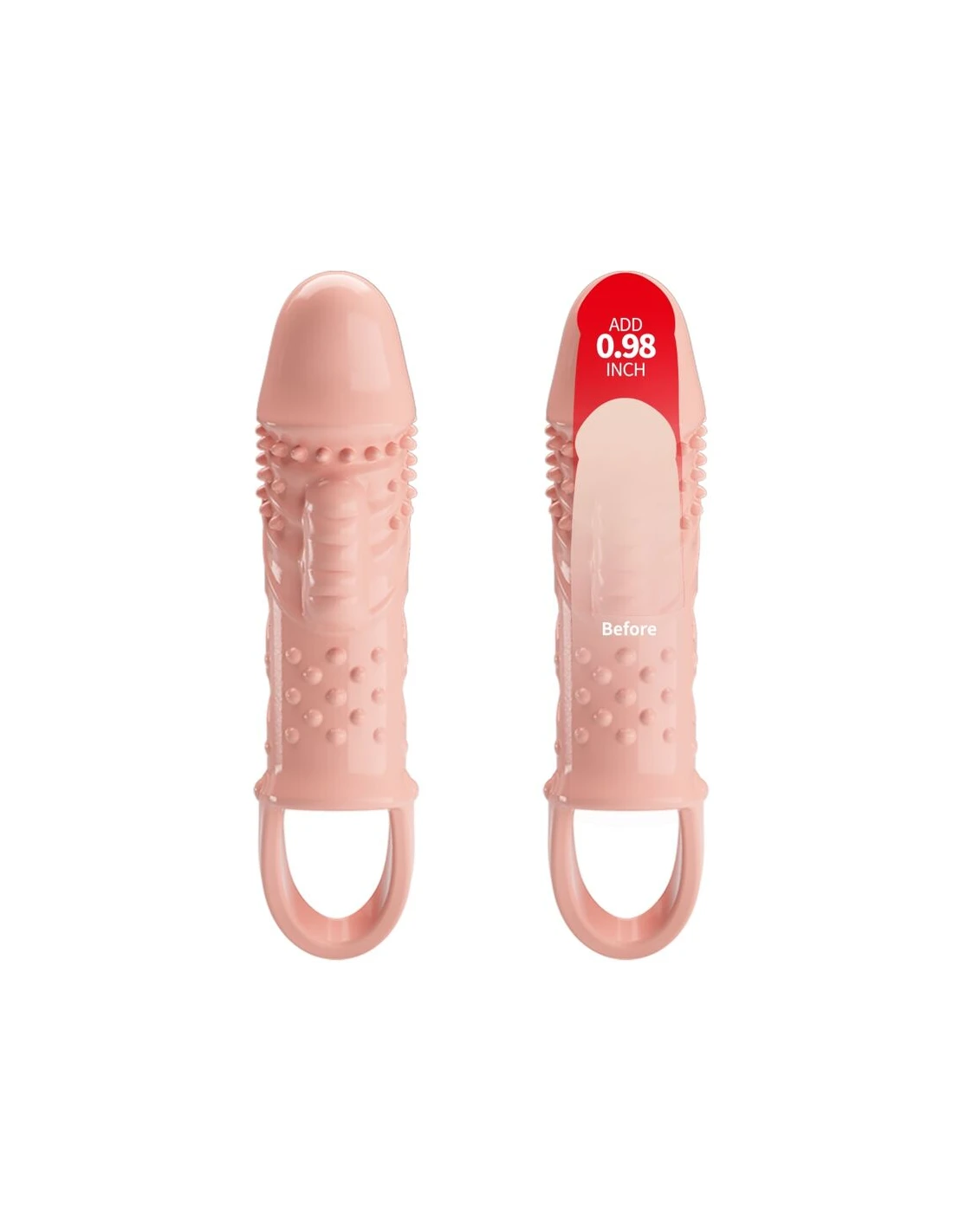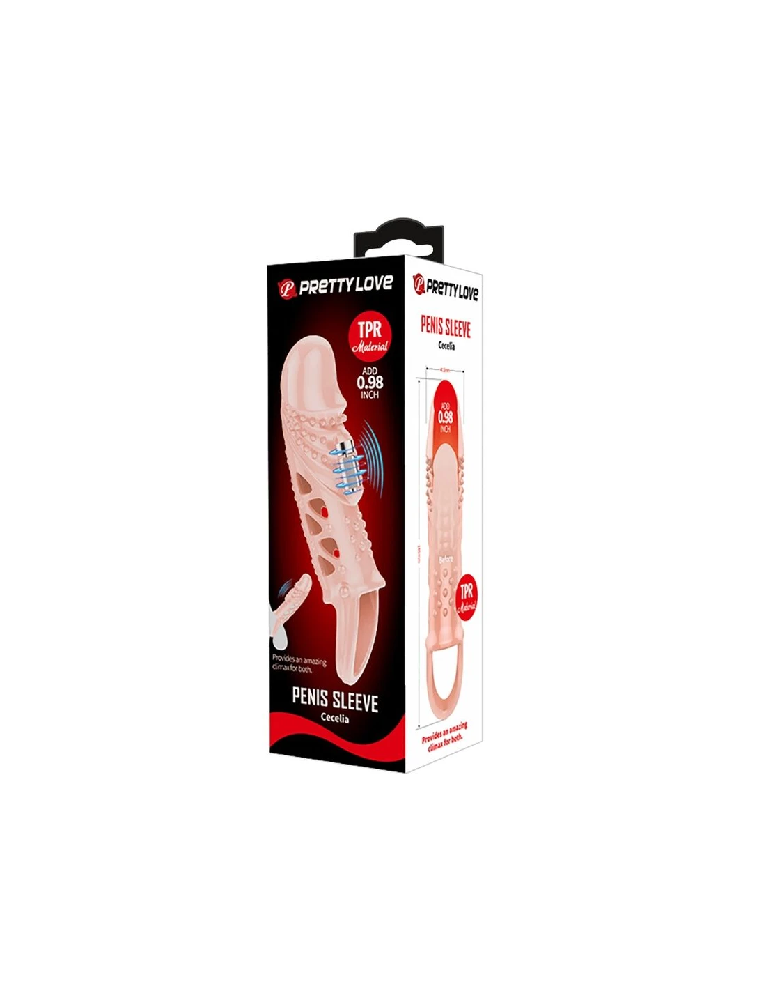 Diviértete con esta funda vibradora para el pene. Esta funda para pene que mejora la erección y promete placer está hecha de TPR suave y está asegurada en su lugar por un lazo de bola. Un vibrador en la punta extiende la longitud de su pene y se activa al contacto. Estimulando la cabeza de su eje, también proporciona estimulación interna para ella. La funda elástica envuelve su pene para una erección más fuerte y duradera, ¡lo que le da más tiempo para disfrutar de las vibraciones!