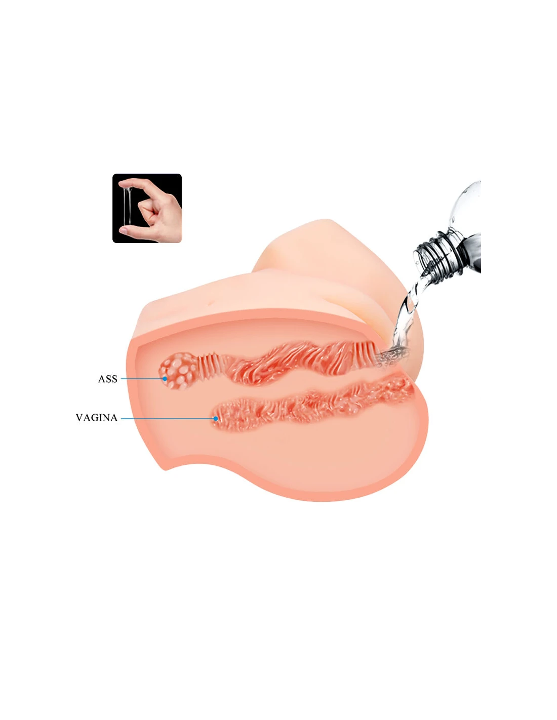 Perfecto para todos tus deseos! Torso sensual con un diseño absolutamente realista fabricado en material de piel de agua. Tiene dos aberturas que son réplicas realistas de una vagina y un ano. Los túneles del placer están abiertos por ambos extremos. Ambos túneles de placer son estrechos, flexibles y destacan por su textura estimulante. Simplemente agregue unas gotas de agua para hidratar los túneles y le brindará una experiencia sexual realista. Las vibraciones de varias velocidades se pueden controlar fácilmente mediante el control remoto. Pida las pilas por separado (3x AAA).