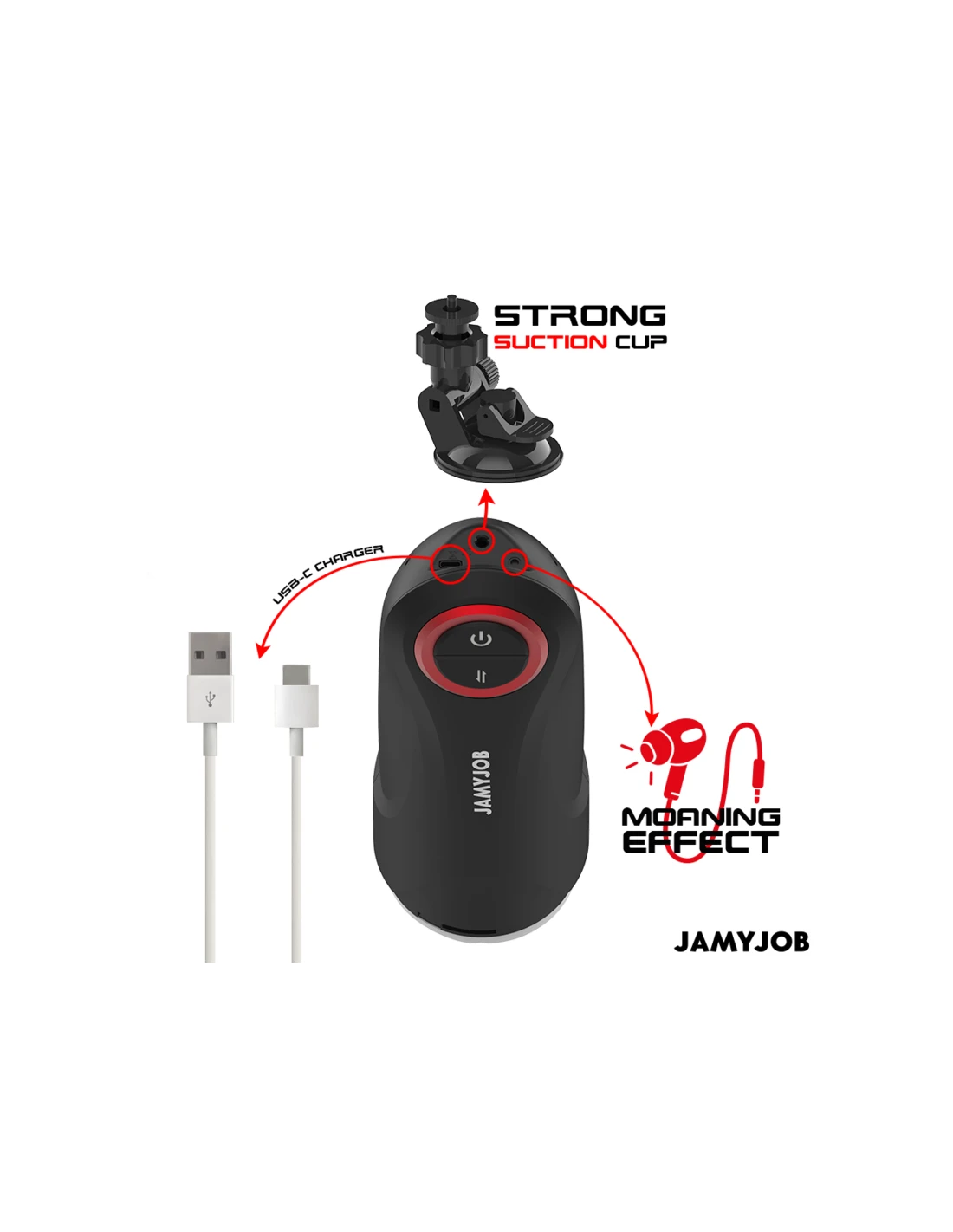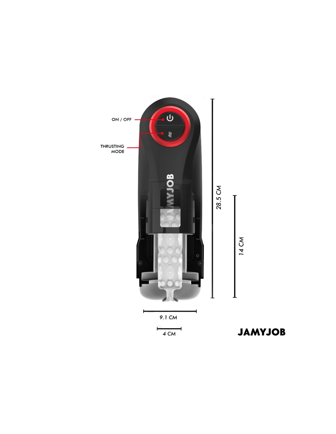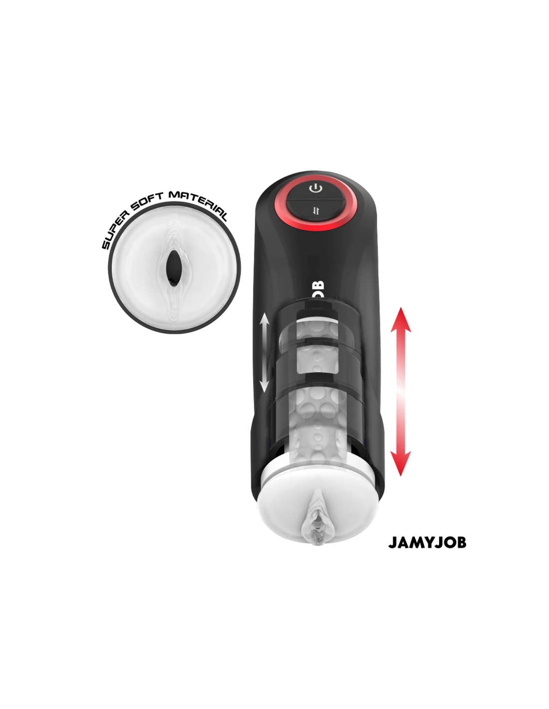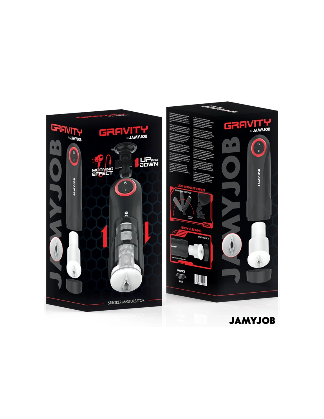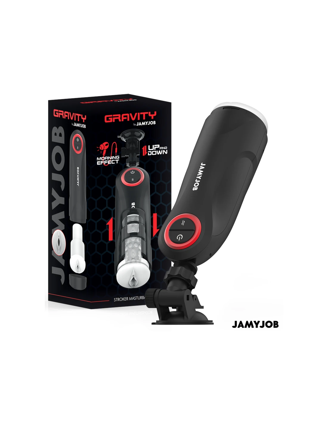 El masturbador automático para hombre GRAVITY de la marca JAMYJOB es un dispositivo innovador y elegante, diseñado para proporcionar una experiencia estimulante y placentera de alta calidad. Con un diseño en color negro que destaca por sus detalles en rojo, este masturbador combina estética y funcionalidad en un solo producto.