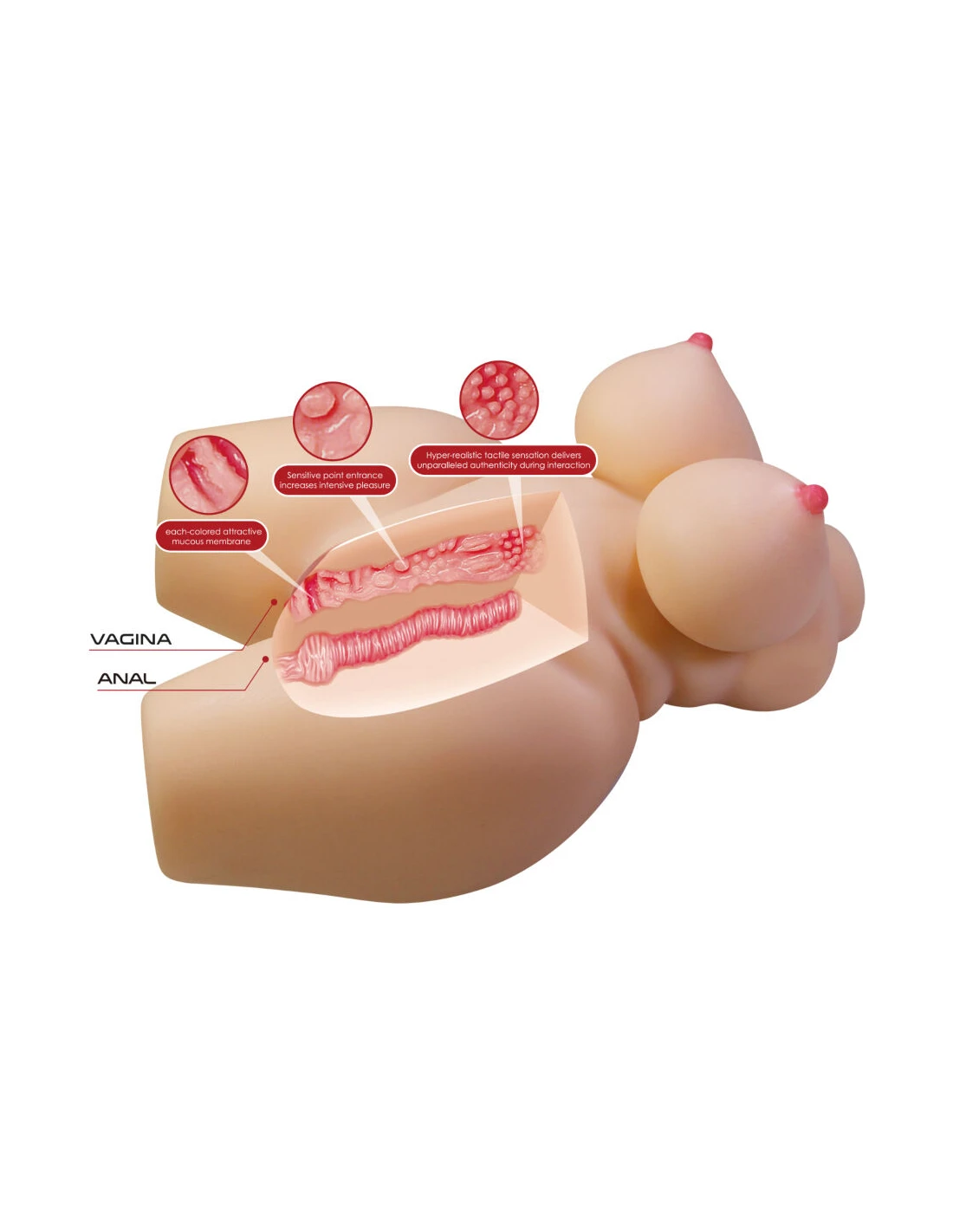 Grace está fabricado en TPR de alta calidad, un material seguro para el cuerpo, suave al tacto y fácil de limpiar, que asegura un uso higiénico en todo momento. Gracias a la exclusiva tecnología Sort Skin, su superficie reproduce de manera sorprendente la textura de la piel humana, aportando una elasticidad natural y una sensación hiperrealista al contacto. Su diseño cuenta con dos orificios independientes (vaginal y anal), lo que amplía las posibilidades de disfrute y proporciona diferentes tipos de estimulación según las preferencias del usuario. Cada entrada está cuidadosamente esculpida para ofrecer una autenticidad fisiológica inigualable, replicando con gran realismo las sensaciones del cuerpo femenino.