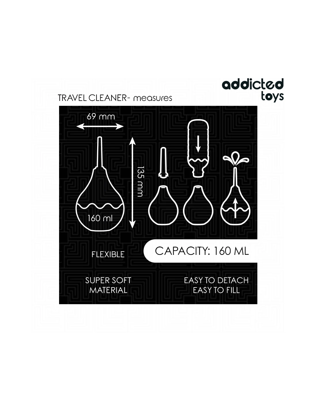 El limpiador anal de viaje talla M de Addicted Toys es una opción ideal para quienes buscan un producto eficaz y práctico para mantener una higiene adecuada antes o después de la estimulación anal. Con un tamaño compacto pero de mayor capacidad (160 ml), es perfecto para quienes desean un limpiador más grande que aún sea fácil de llevar en su viaje o de almacenar de manera discreta. Su diseño ergonómico asegura comodidad y control durante su uso.