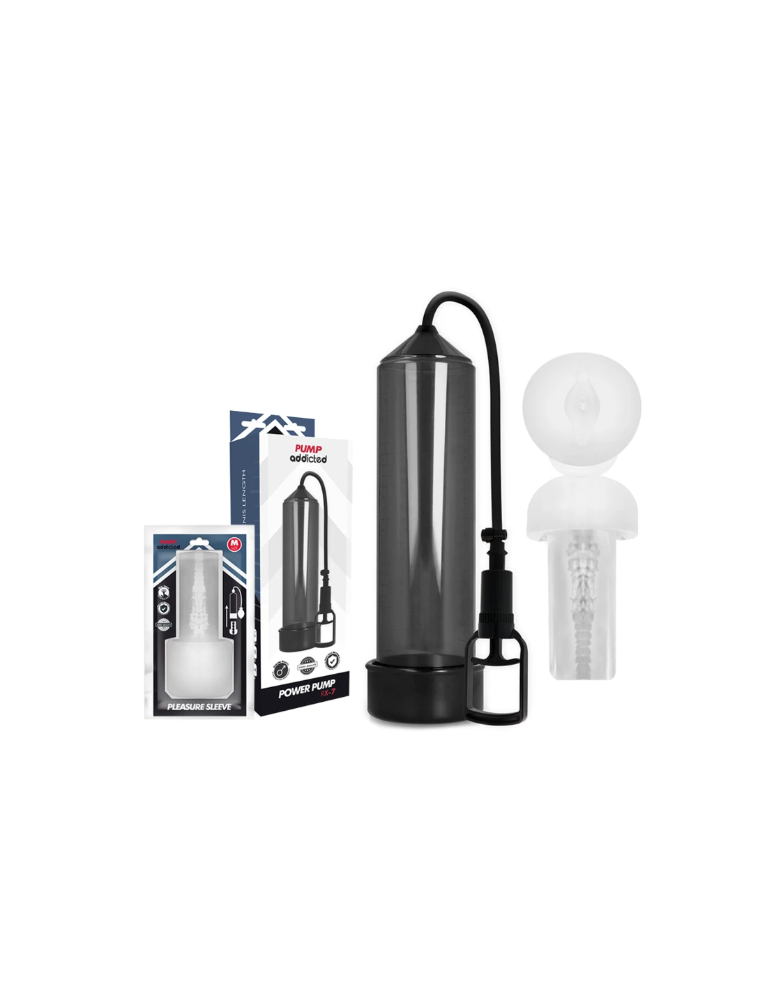 Por si fuera poco, también puede ser combinado con algunos modelos de la serie Pump la manga masturbadora pleasure sleeve, disponible en dos tamaños, este fabuloso accesorio convierte a tu Pump Addicted favorito en un masturbador, pero por si fuera poco al hacer el vacío el tamaño del pene se multiplica por 5 visualmente un efecto óptico realmente atractivo cuando utilizas Pump