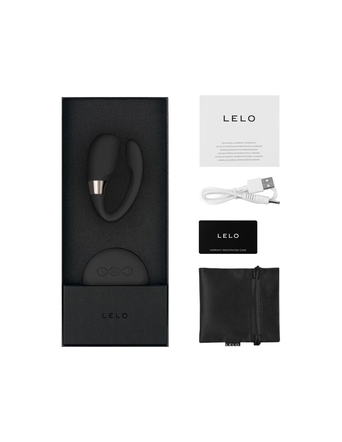 Tiani 3 se presenta en la galardonada caja LELO con su cargador específico del país, una bolsita de satén para guardarlo, lubricante monodosis de regalo y la garantía completa de 1 año