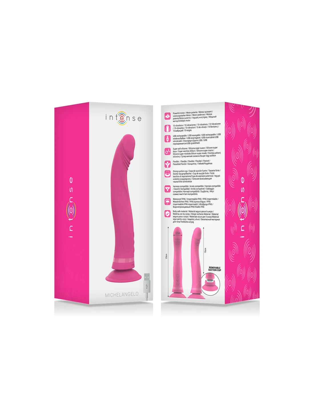 Intense™ Michelangelo es el vibrador de silicona súper suave de primera calidad, de doble densidad: máxima sensación, densidad y flexibilidad. Con su ventosa extra potente podrás adherirlo en cualquier superficie. Intense™ Michelangelo con Motor de vibraciones poderosas.