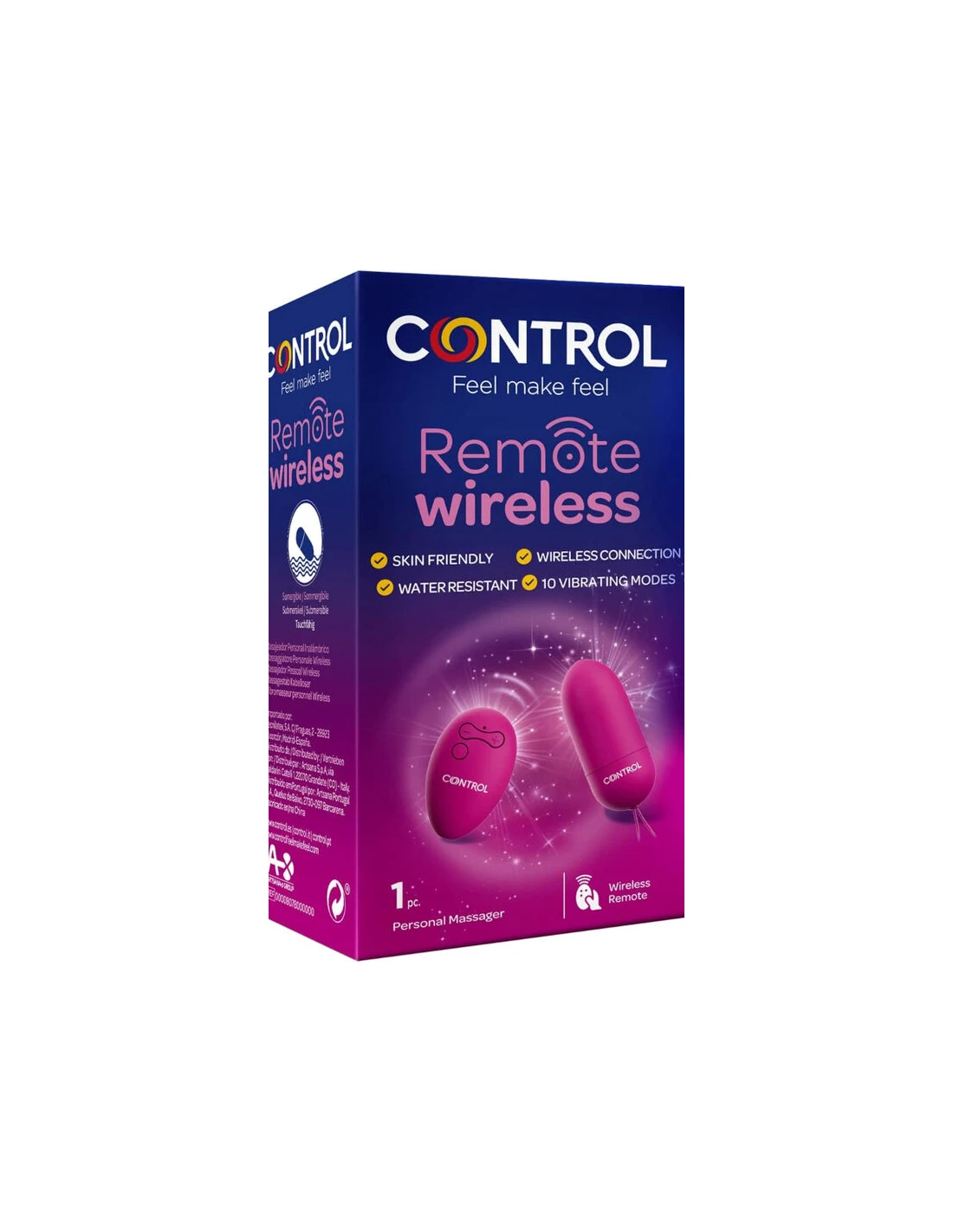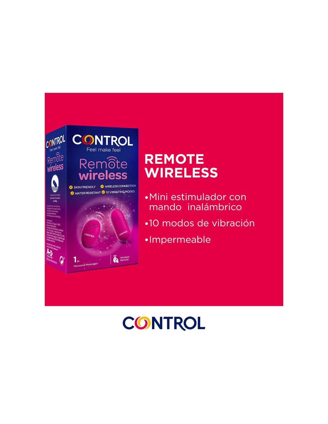 El Vibrador a distancia Control Remote Wireless de Control es un estimulador íntimo. Está compuesto de dos partes, masajeador y mando a distancia.