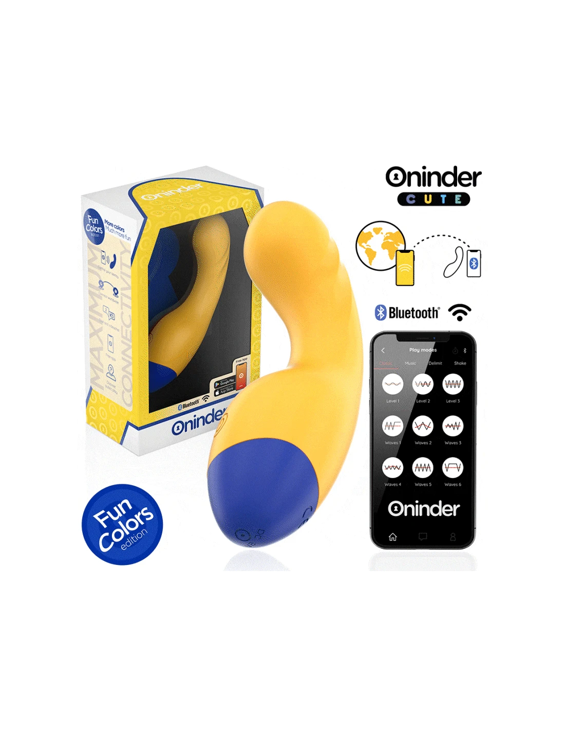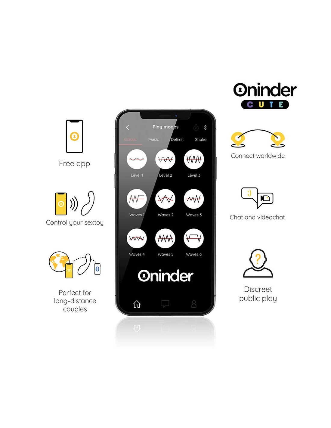 Con este vibrador no solamente puedes elegir entre combinaciones de intensidad y vibraciones preestablecidas, sino que también puedes compartir a un innovador control basado en una aplicación. Simplemente tienes que descargar la aplicación gratuita ONINDER™   en tu dispositivo Android o iOS y conectar tu smartphone o Tablet.