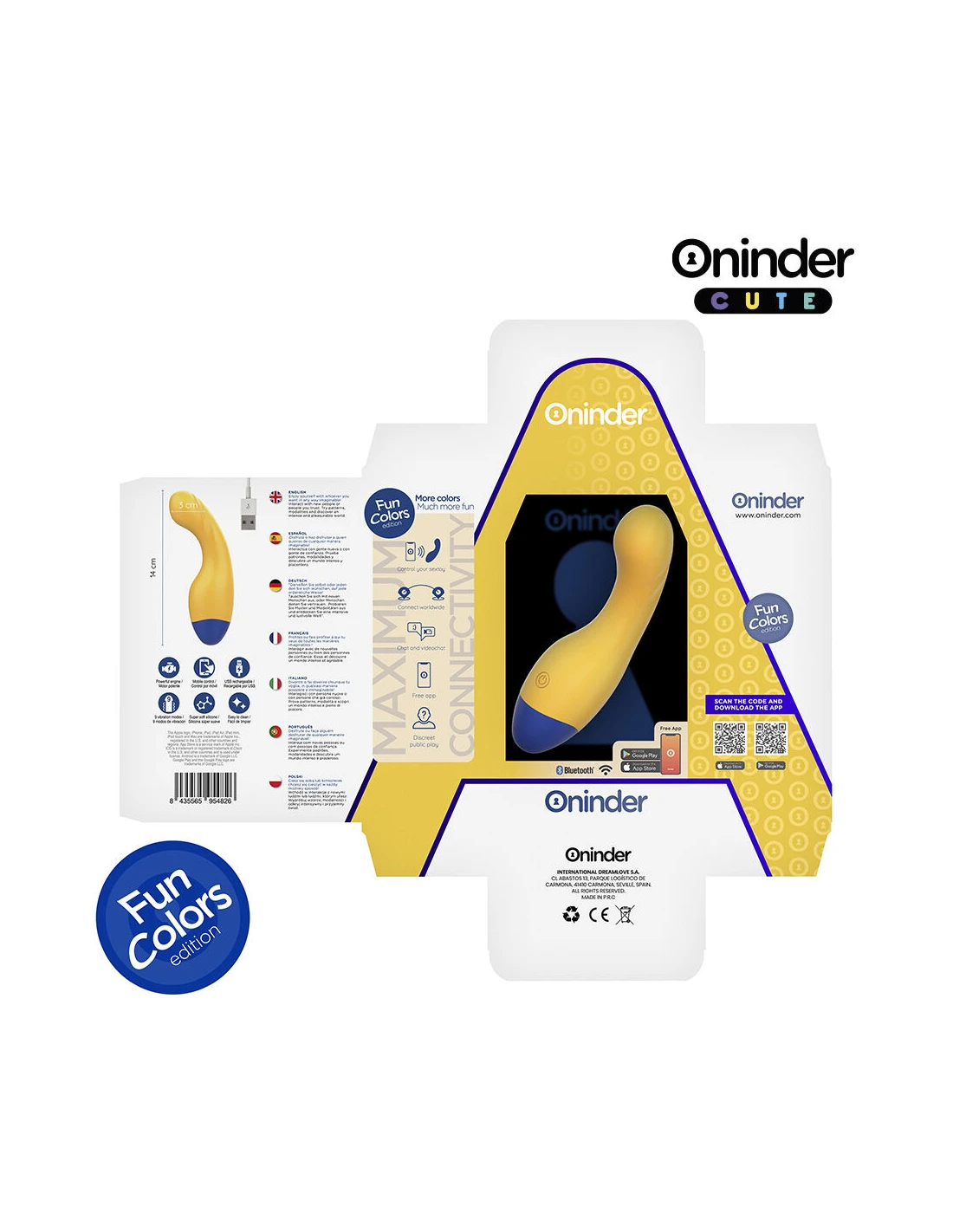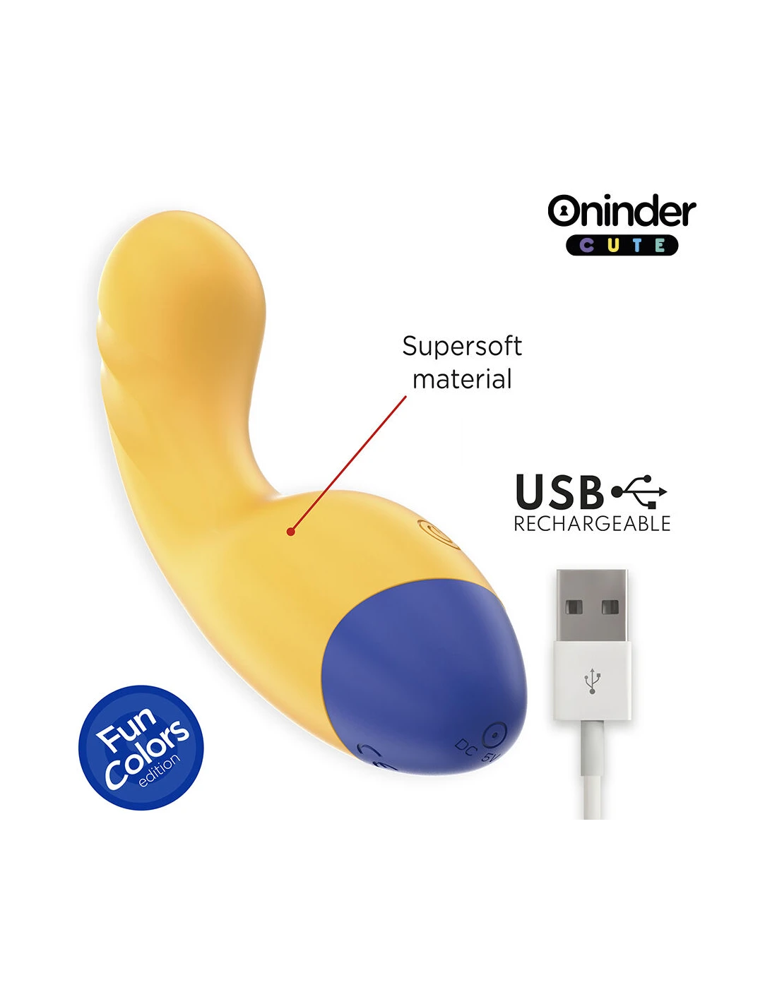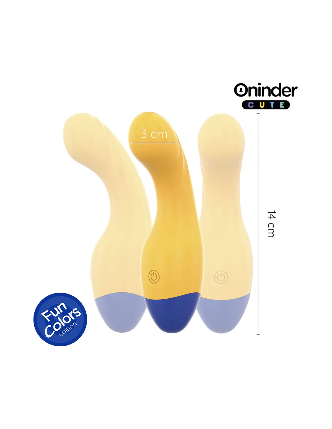 Con un tamaño ideal de 14 cm de longitud total y 3 cm de diámetro, este vibrador es perfecto tanto para la estimulación interna como externa. Su forma estilizada y ergonómica se adapta cómodamente a la mano y al cuerpo. Además, su combinación de amarillo vibrante con base azul oscuro le otorga un estilo llamativo y moderno, acorde con la colección ONINDER CUTE.