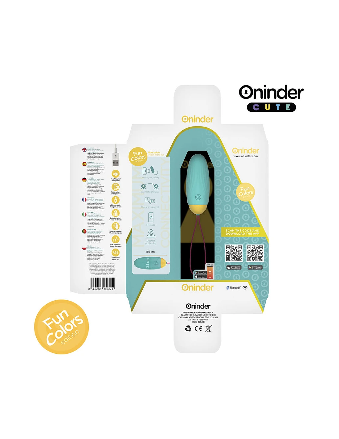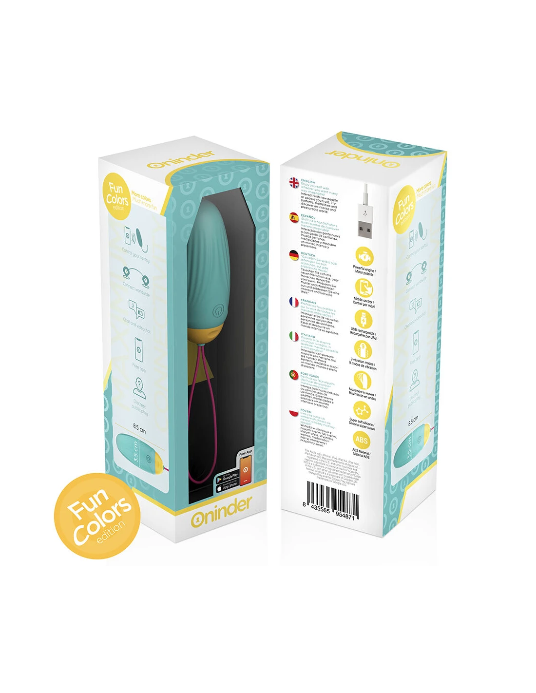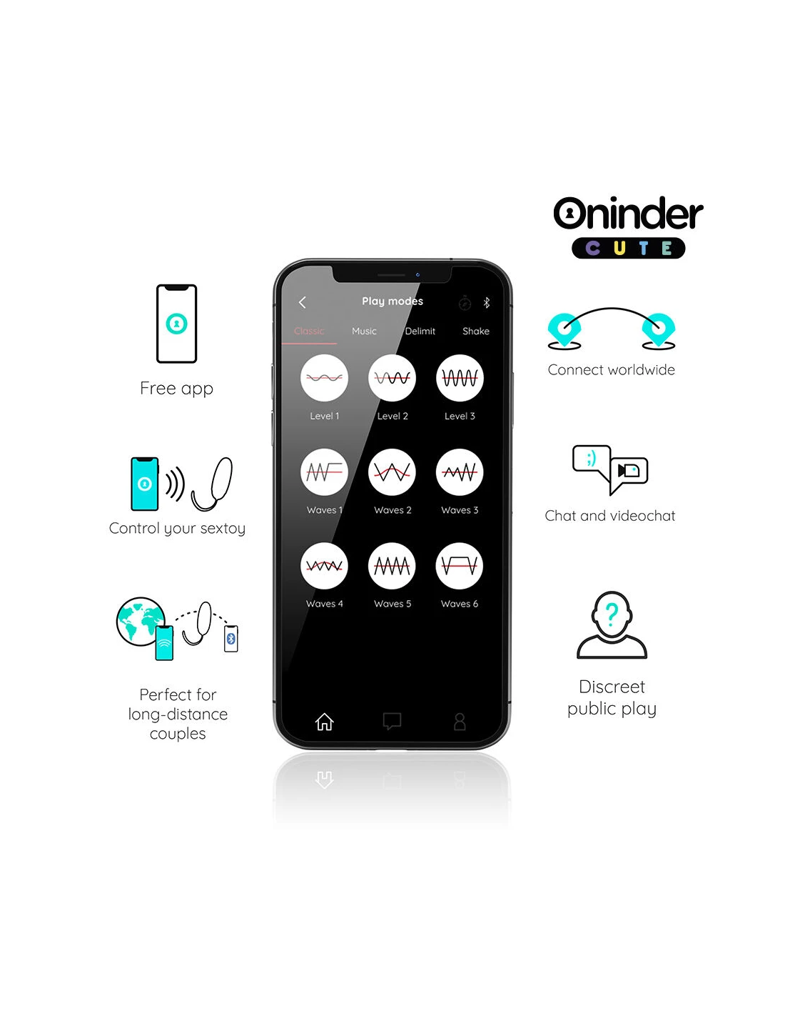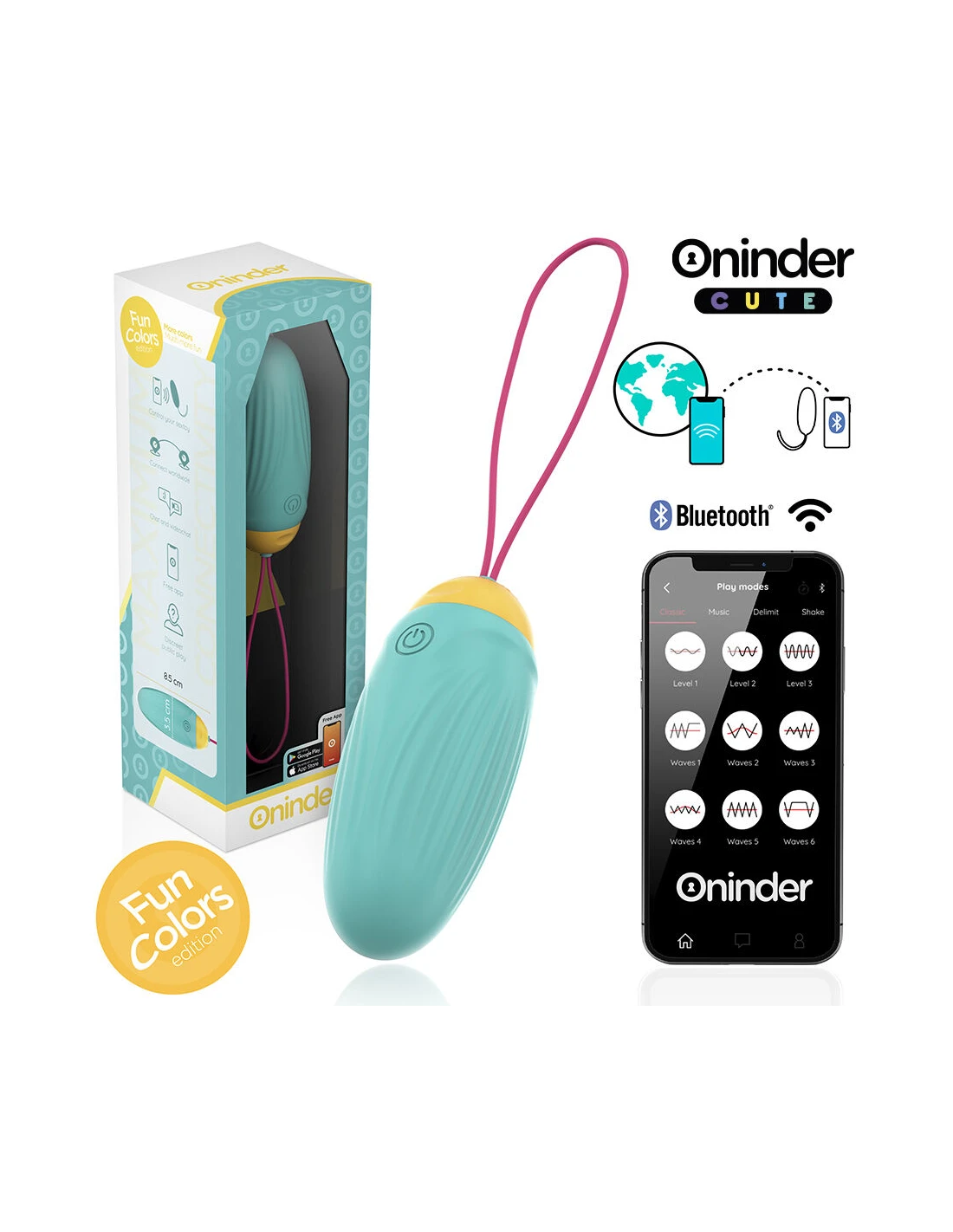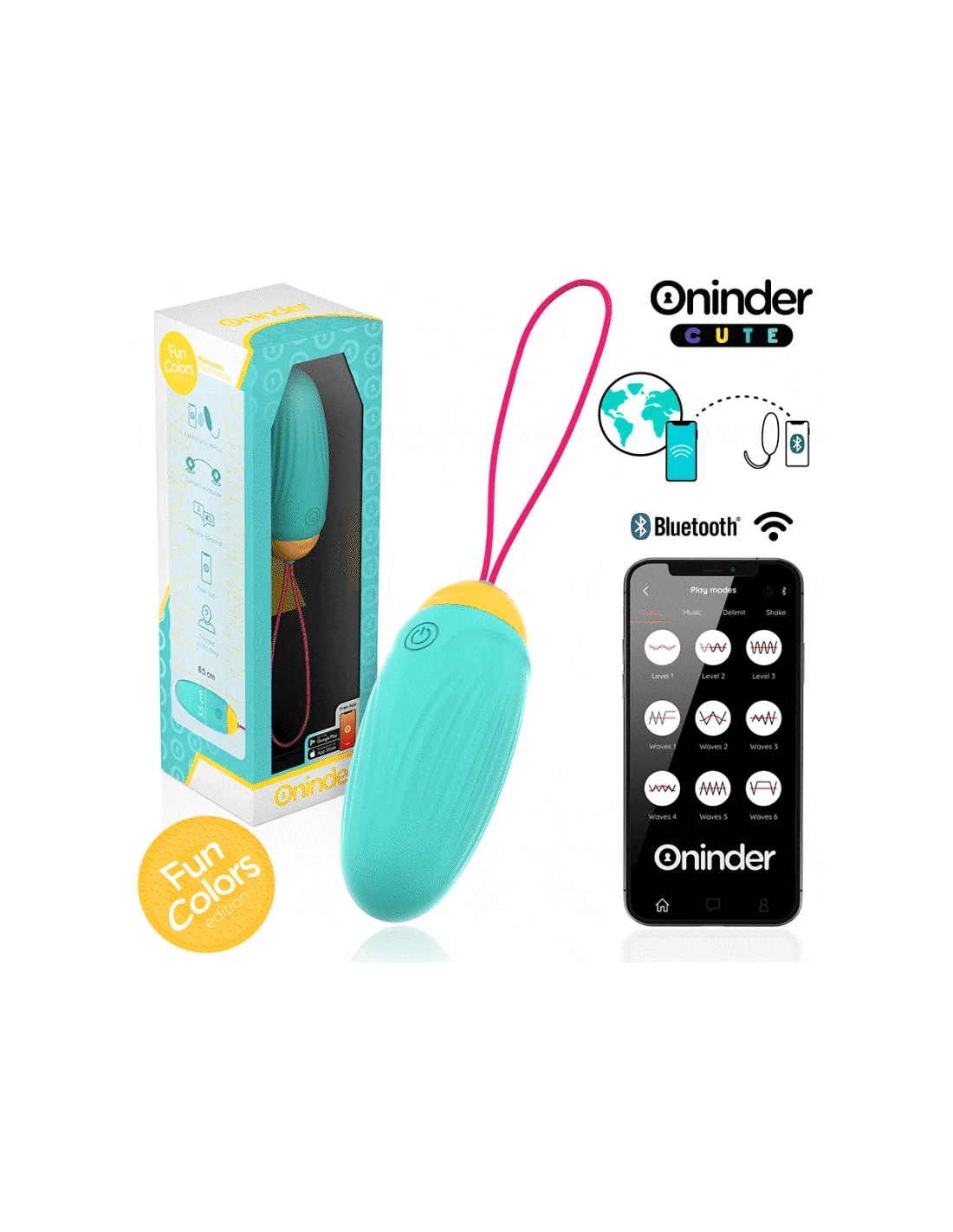 Con este vibrador no solamente puedes elegir entre combinaciones de intensidad y vibraciones preestablecidas, sino que también puedes compartir a un innovador control basado en una aplicación. Simplemente tienes que descargar la aplicación gratuita ONINDER™   en tu dispositivo Android o iOS y conectar tu smartphone o Tablet.
