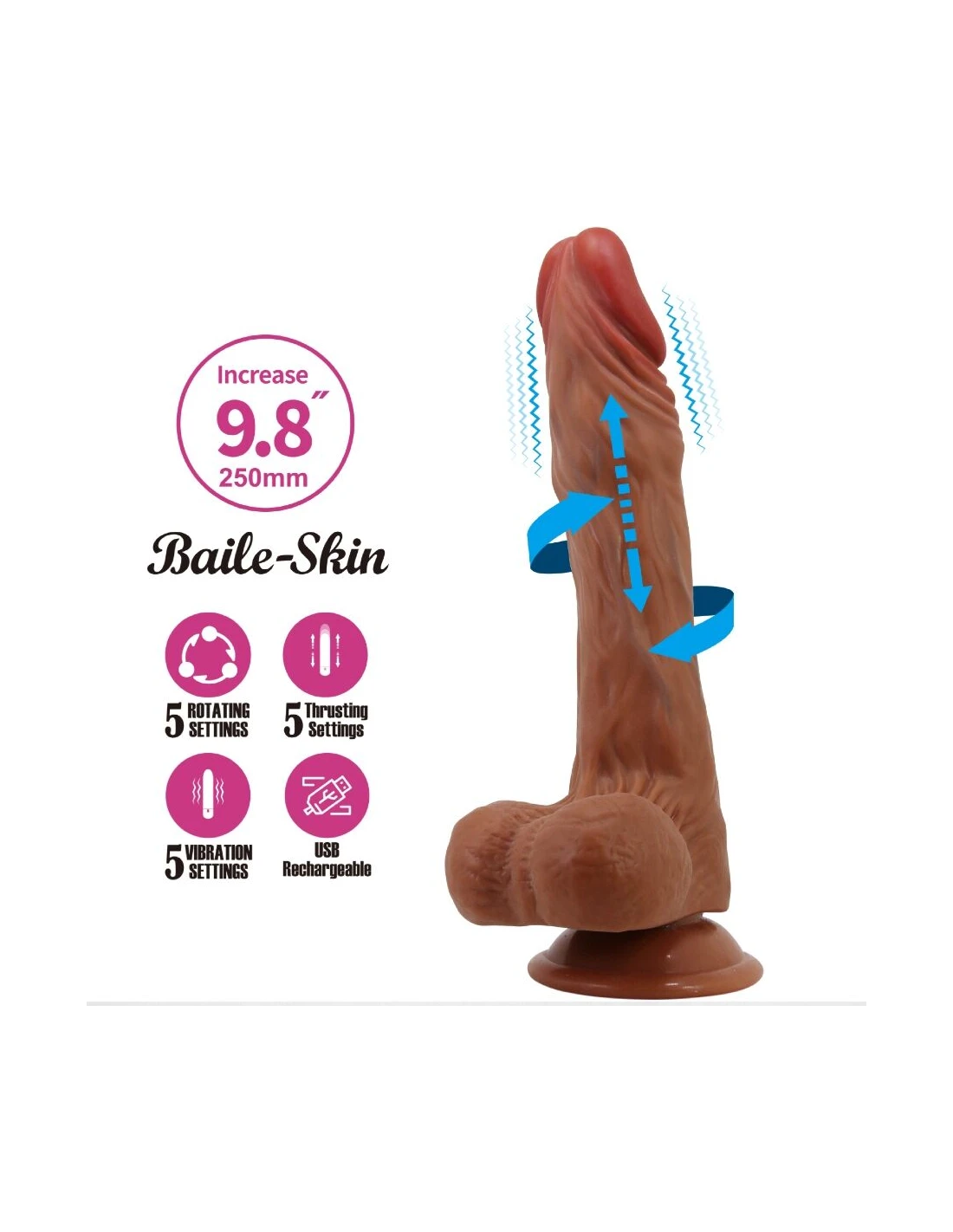 ¡Disfruta de la fiesta de empuje y rotación! ¡El vibrador con tecnología de punta para sensaciones realistas! Este vibrador realista se destaca por sus funciones de empuje y vibración rotatorias extraordinariamente intensas. Se siente casi como si fuera real debido a su glande, venas y testículos realistas y pronunciados. La ventosa permite el placer con manos libres. Deja que este vibrador realista encienda todos tus deseos más profundos y te brinde un momento de felicidad sexual.