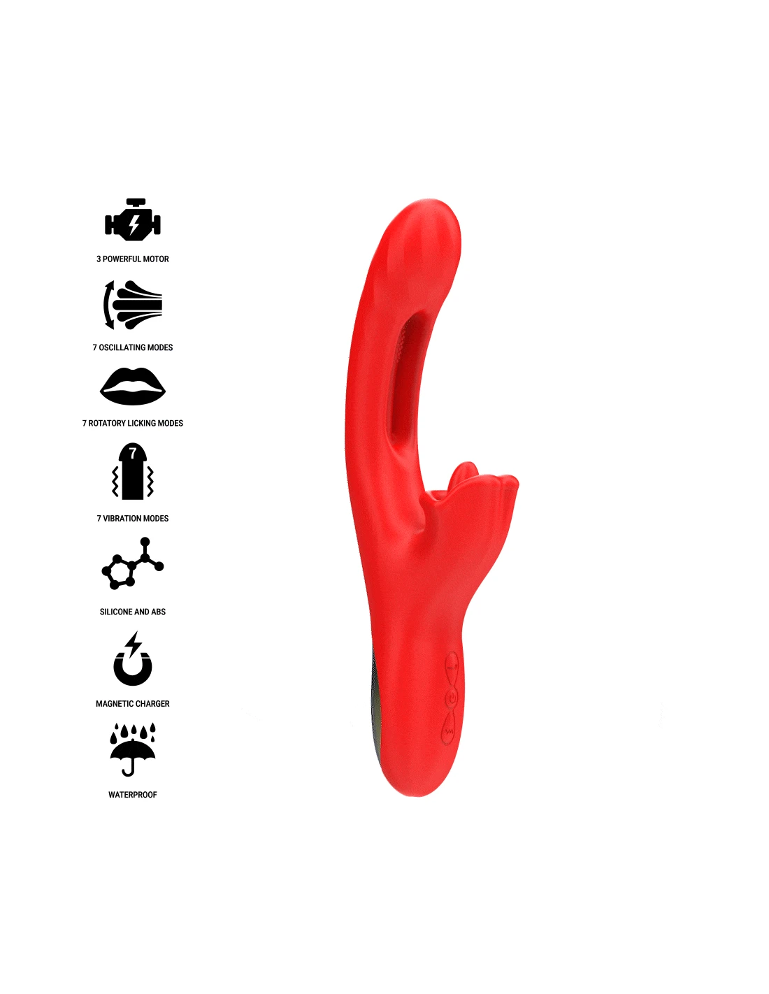 El estimulador clitorial cuenta con 7 modos de "licking" rotatorio, simulando delicadamente el movimiento de la lengua para una estimulación precisa e irresistible. Al mismo tiempo, su eje insertable incorpora 7 modos de oscilación interna, diseñados para masajear y estimular las paredes vaginales de forma rítmica y envolvente. A ello se suman 7 modos de vibración que recorren el cuerpo del vibrador, potenciando cada sensación para llevarte al clímax de forma personalizada.
