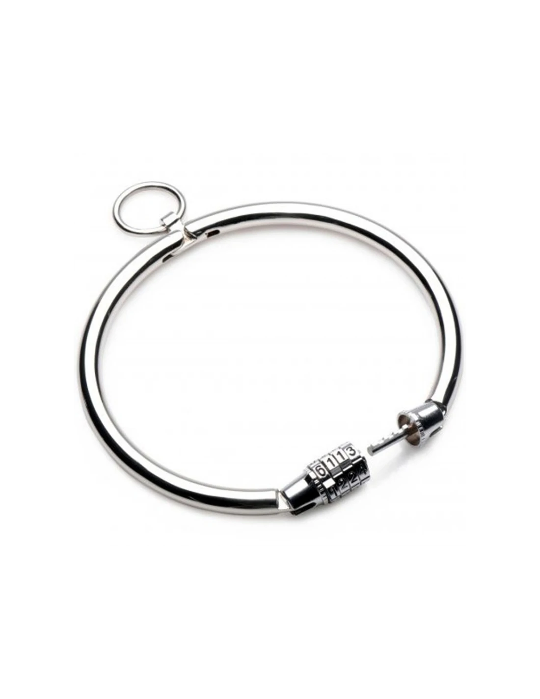 Controla absolutamente a tu sumiso o sumisa con este excitante collar. Está fabricado de metal y es bastante pesado, además es inoxidable y muy fácil de limpiar. Puede cerrarse con candado con combinación numerica. De esta forma se puede estar seguro que no hay forma de escapar. Hay adjunto una anilla de metal para que se le puedan incorporar juguetes al collar como por ejemplo cuerdas, cadenas o esposas.