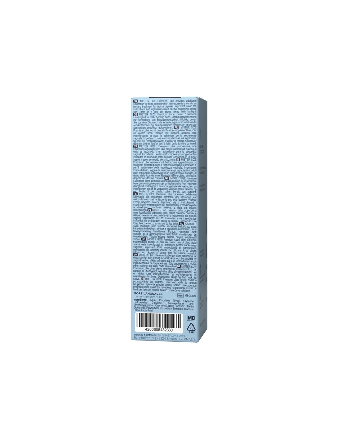 El gel lubricante MISTER SIZE contiene solo ingredientes de alta calidad para una compatibilidad óptima con la piel. El gel lubricante MISTER SIZE está dermatológicamente probado, no contiene grasa, es incoloro, inodoro y sin sabor.