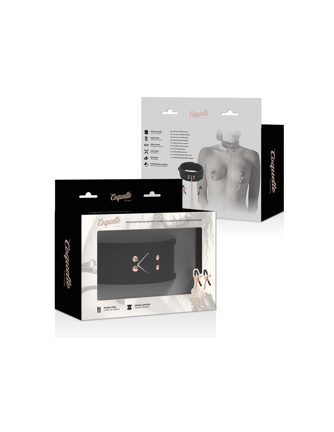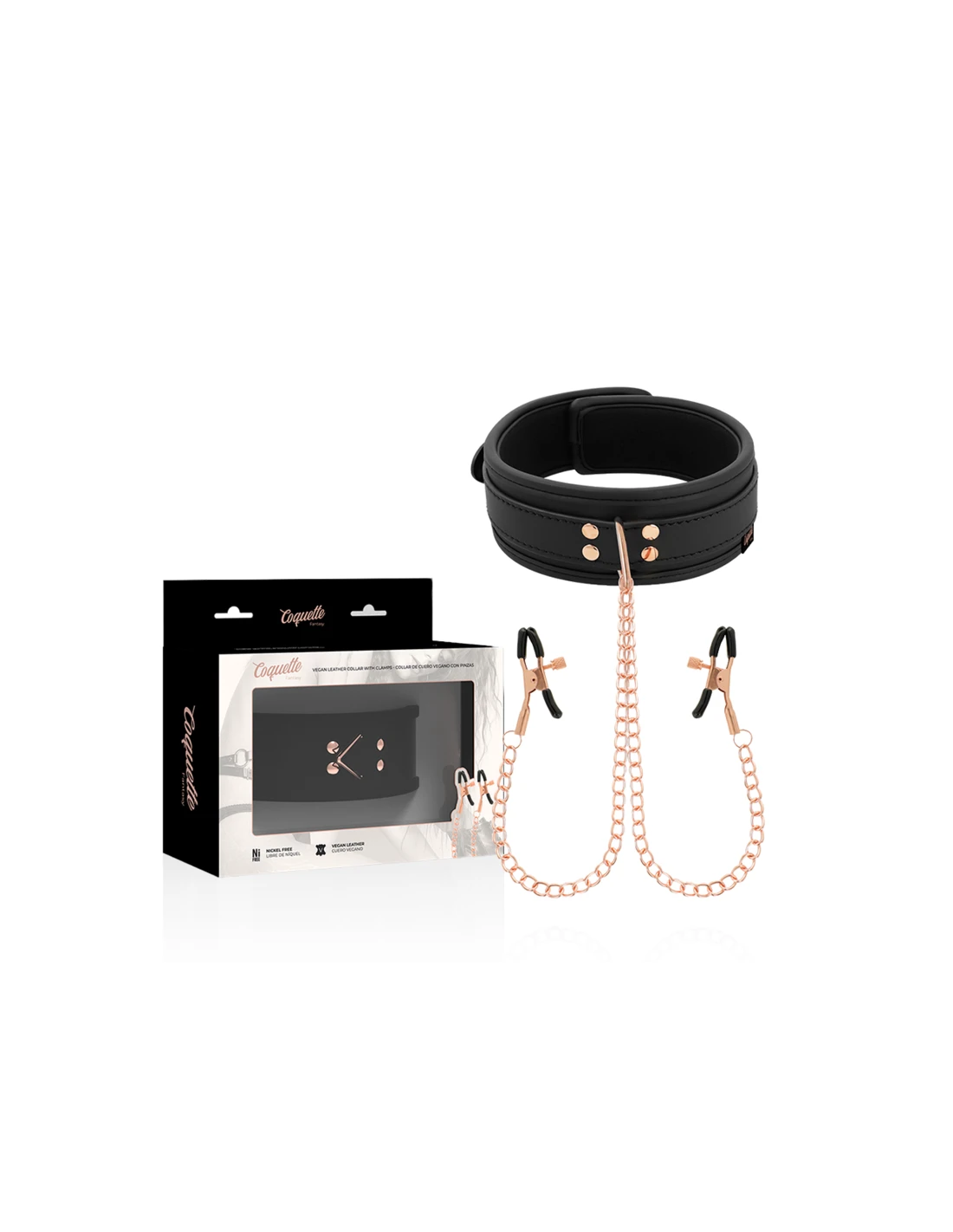 ppCOQUETTE CHIC DESIRE FANTASY collar de cuero vegano con pinza para pezones unido por cadena metal Incluida ppFabricado de suave cuero vegano y acabado con dos pinzas para pezones con cadenas este set de collar con pinzas te asegura a tu sujeto al momento pp El comodo collar se ajusta facilmente a casi todas las tallas mientras que las pinzas para pezones te ofrecen justo la tension adecuada en el lugar adecuado pp Simplemente ajusta el tornillo a los pezones hasta que quede ajustado y confortable y empieza a disfrutar de placer de un buen pellizco Sus recubrimientos de goma permitiran que con la accion del momento no se deslicen y permanezcan en su lugar ppEl collar de cuero cuenta con una resistente anilla para conectar una correa Correa incluida y asi tener a tu sujeto bien sujeto Las pinzas en los pezones estan conectados al collar con cadenas de metal ppEs perfecto para principiantes y lo suficientemente duradero para los entusiastas del fetiche con mas experiencia Este collar de esclavo con cuero vegano cadena metalica libre niquel y resistente es perfecto para jugadores avanzados ppUtiliza este juguete solo o con otros articulos de COQUETTE CHIC DESIRE FANTASY pulliFabricado en material Neopreno Metal libre de niquel y Cuero veganopLa coleccion COQUETTE CHIC DESIRE FANTASY es la perfecta para el BDSM calidad y resistencia aptas para cualquier juego ppstrongComo se puede practicar de manera saludablep La comunicacion es vital Por un lado todas las partes involucradas deben expresar verbal y claramente su consentimiento en realizar algunas de estas practicas Pero no es todo tambien debe haber una conversacion previa sobre los llamados limites blandos aquellos que estoy dispuesto a ceder y o negociar y los limites duros aquellos que no estoy dispuesto a transar ppUsar la llamada palabra de seguridad vale decir elegir una determinada palabra que signifique detenerse ya sea porque algo es incomodo doloroso o no placentero Se recomienda que sea un color o una palabra que no se diga generalmente durante el acto sexual como un color suave o una cosa por ejemplo amarillo o rosa para que el dominante o sumiso la escuche y se detenga Tambien se aconseja no utilizar palabras como No o Para ya que para la otra persona puede ser aun mas estimulante ppNo ocupar elementos que impliquen un riesgo para la otra persona es decir implementos que han sido creados especificamente para estas practicas y por ello es muy importante utilizar productos como COQUETTE CHIC DESIRE FANTASY Los juguetes sexuales tambien pueden incluirse de forma segura a estas practicas ya sea para el sexo penetrativo masturbacion o estimulacion externa ppJamas olvidarse del uso del condon ya que solo asi se estara previniendo la transmision de enfermedades de transmision sexual ppPor otro lado si es la primera vez que se incursiona en estas practicas lo primero que hay que hacer es informarse y asesorarse bien para saber de que se trata sus mitos y verdades Sugerimos partir por lo menos intenso e ir subiendo la intensidad solo asi los involucrados podran ir descubriendo sus limites lo que les gusta o no En este aspecto en COQUETTE CHIC DESIRE FANTASY disponemos de productos que pueden ser un gran apoyo para este camino Tambien hay juegos de mesa que ayudan a romper el hielo para ir probando y descubriendo nuevas sensaciones ppY por supuesto tal como mencionamos anteriormente de manera previa tener una conversacion clara y honesta con la pareja sobre los limites y por cierto sobre el consentimiento para realizar algunas o todas las practicas que forman parte del BDSM