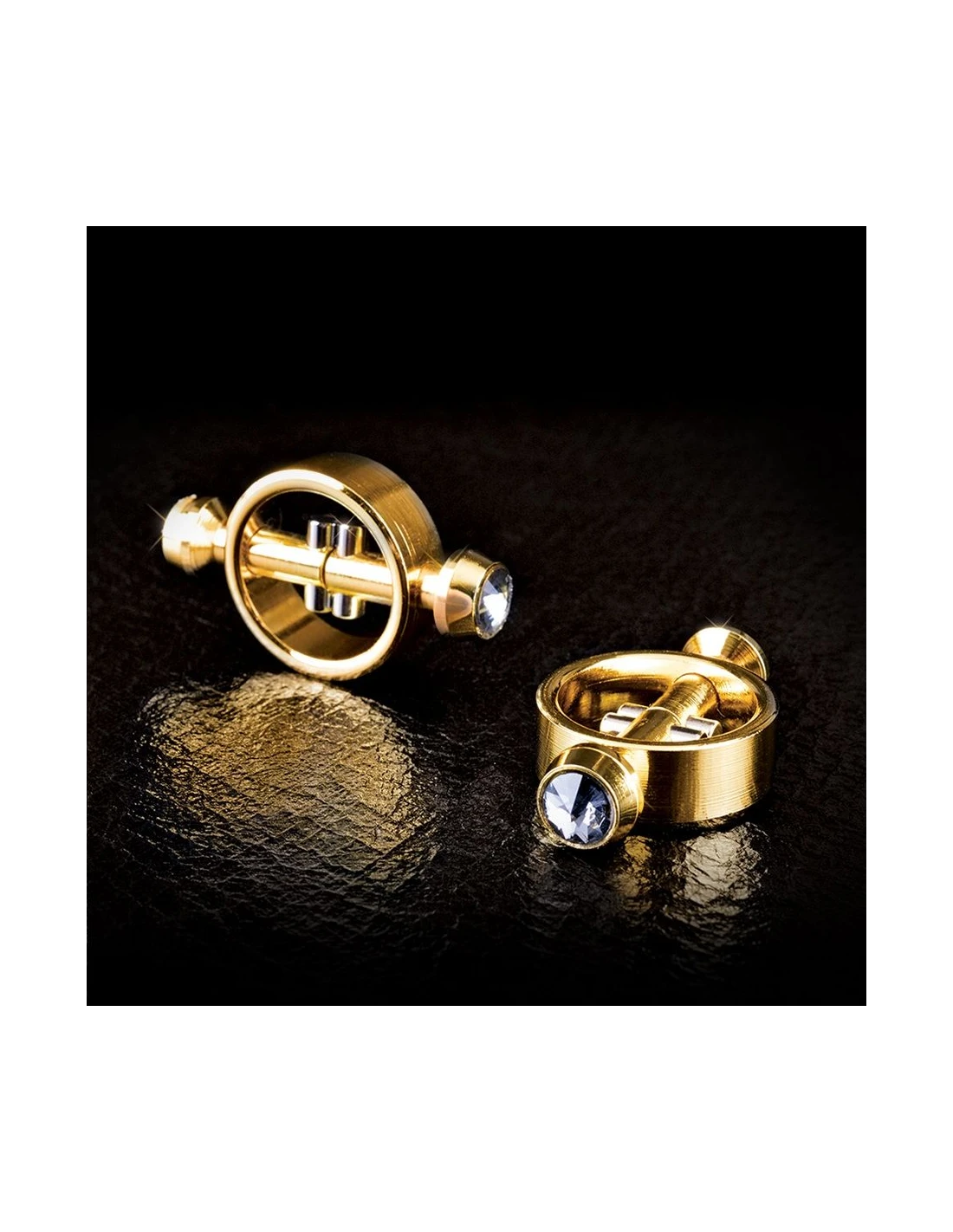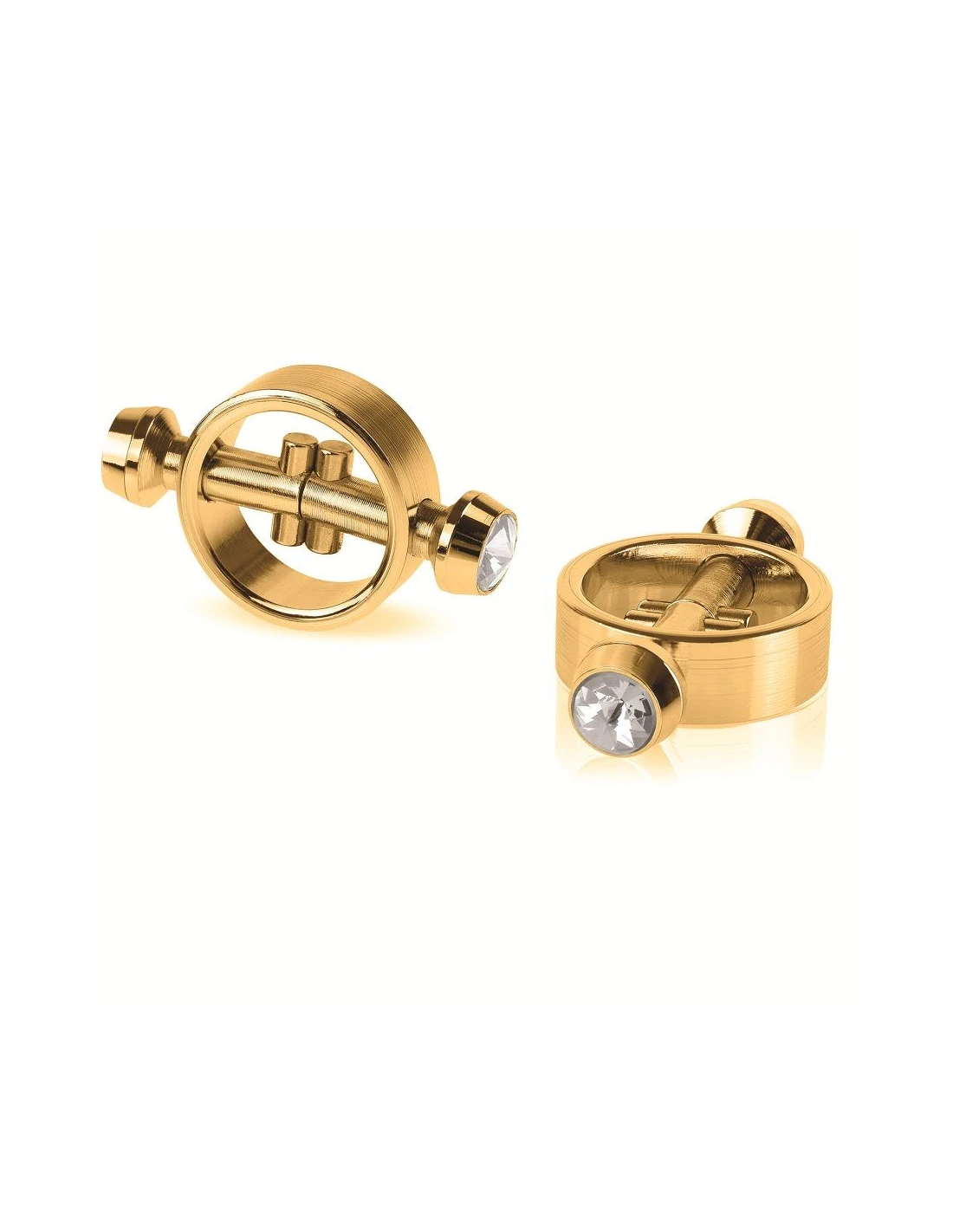 ppDale a la palabra metales preciosos un nuevo significado con este par de pinzas magneticas para los pezones de lujo ppFundidas en acero de alta calidad y pulido a mano a la perfeccion estas joyas juntan el placer y el arte a partes iguales ppEl acabado dorado es liso no porosoy facil de limpiar mientras que el diseno esta inspirado en el cuerpo y el hecho para excitar