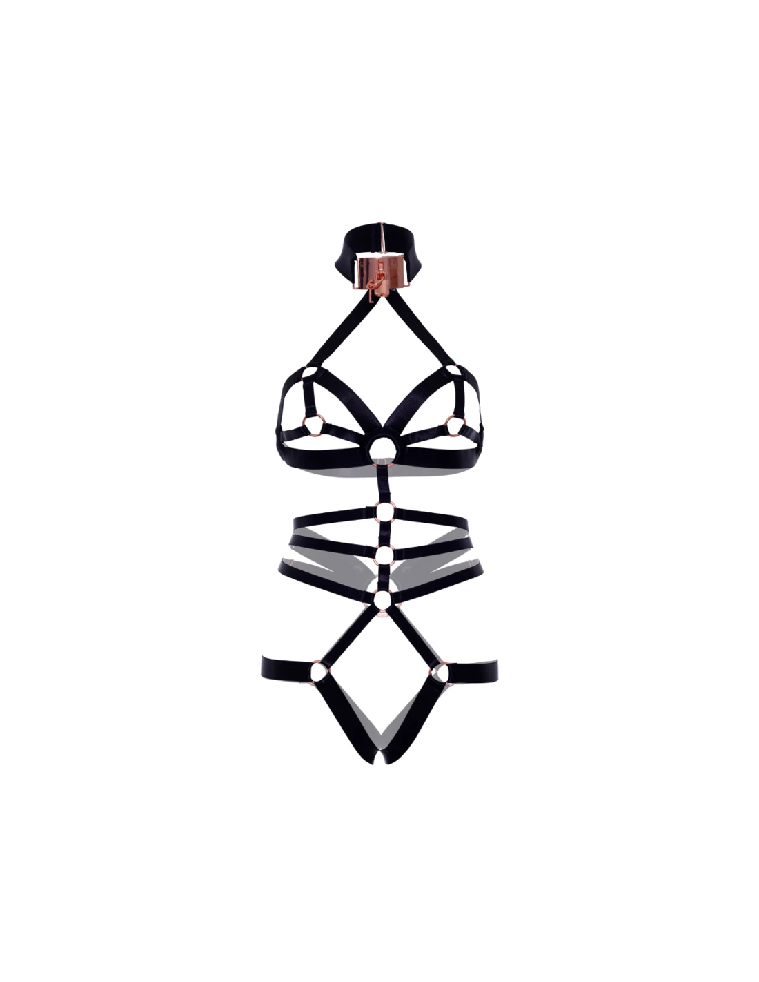 Atraiga sus deseos más íntimos con nuestro osito de satén elástico sin entrepierna y junta tórica. Deja que las correas ajustables y la gargantilla con llave y candado en oro rosa te transporten a un mundo de pasión y sumisión. Atrévete a explorar la emocionante combinación de gracia y tentación, creando una experiencia que no será olvidada.