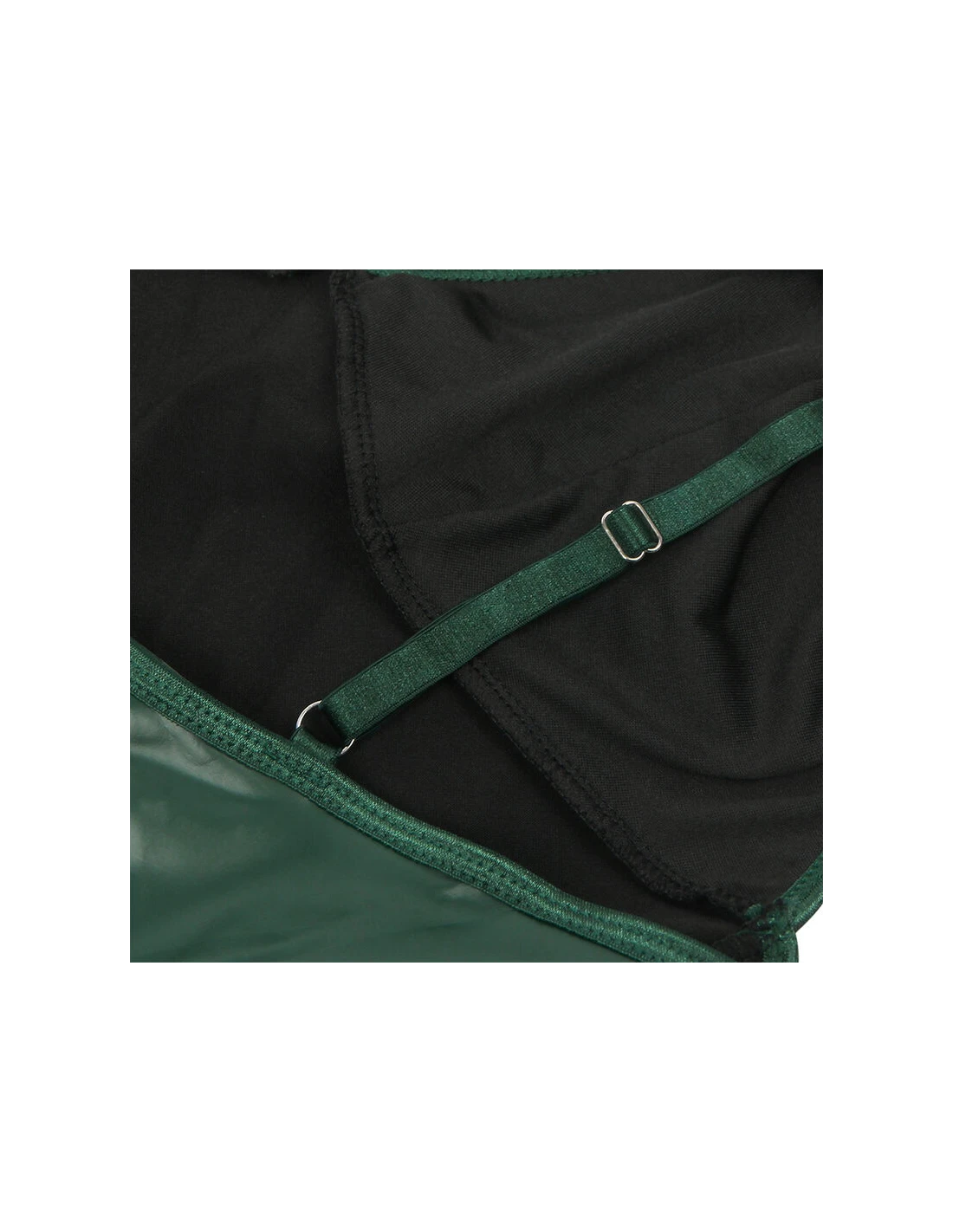 El conjunto está confeccionado con una mezcla premium de 95% poliéster y 5% elastano/spandex, que asegura un ajuste flexible y cómodo que se adapta perfectamente a tu cuerpo. El acabado en cuero PU aporta una textura suave pero con un brillo lujoso, mientras que los tirantes ajustables te permiten personalizar el ajuste para una mayor comodidad y un soporte perfecto. El color verde, fresco y sofisticado, añade un toque de misterio y elegancia, haciendo que esta prenda sea ideal para momentos íntimos y especiales.