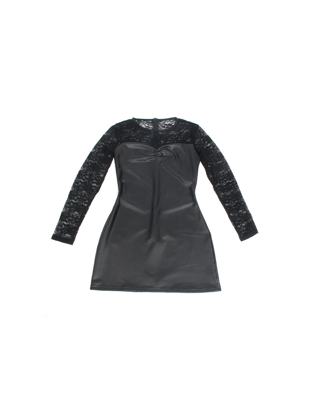 Confeccionado con una mezcla premium de 95% poliéster y 5% elastano/spandex, este camisón ofrece una textura suave, elástica y cómoda que se ajusta perfectamente al cuerpo. Las mangas largas aportan un toque de sofisticación, mientras que los detalles de encaje delicado en el busto y a lo largo del borde inferior le otorgan un aire romántico y seductor. El acabado en cuero PU le da un brillo elegante y audaz, mientras que su ajuste elástico y favorecedor resalta cada curva de manera natural.