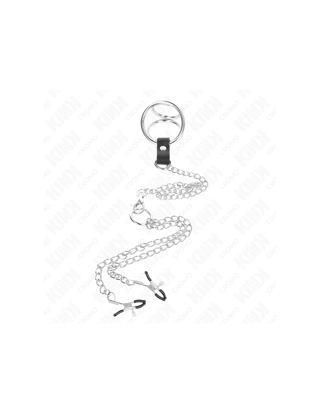 KINK - ANILLO PENE TRIPLE METAL CROMADO 3 CM A 4.5 CM CON CADENA METAL 26 CM Y PINZAS PARA PEZONES
