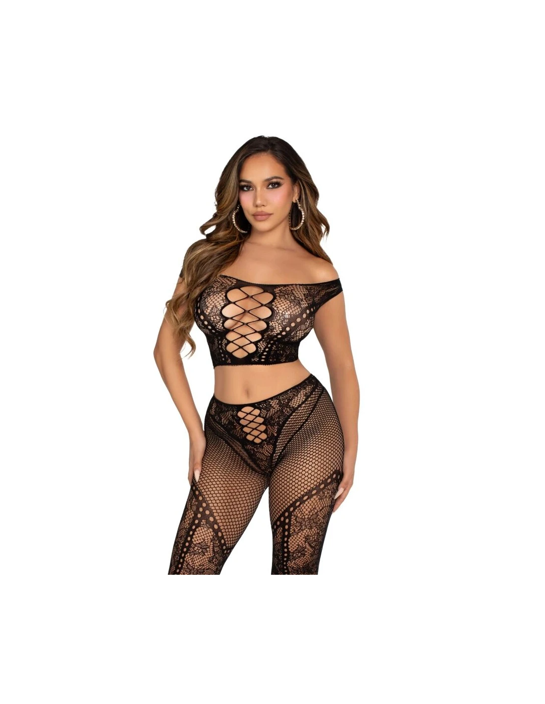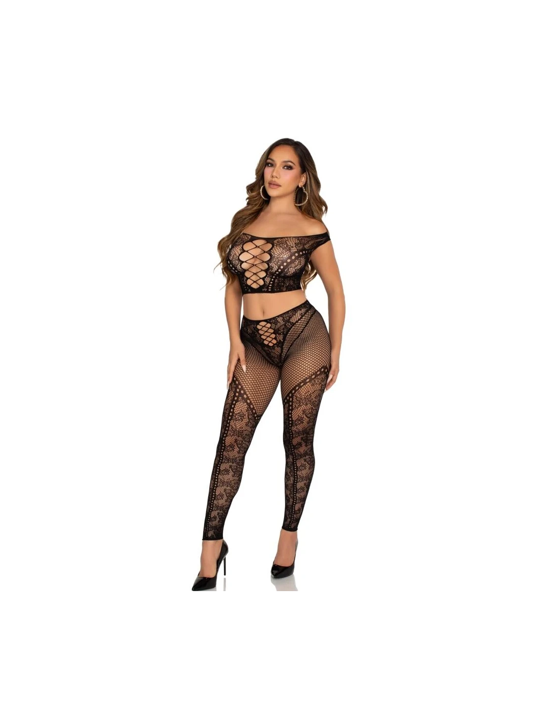 LEG AVENUE - CROP TOP Y LEGGING DE REJILLA CON HOMBROS DESCUBIERTOS NEGRO