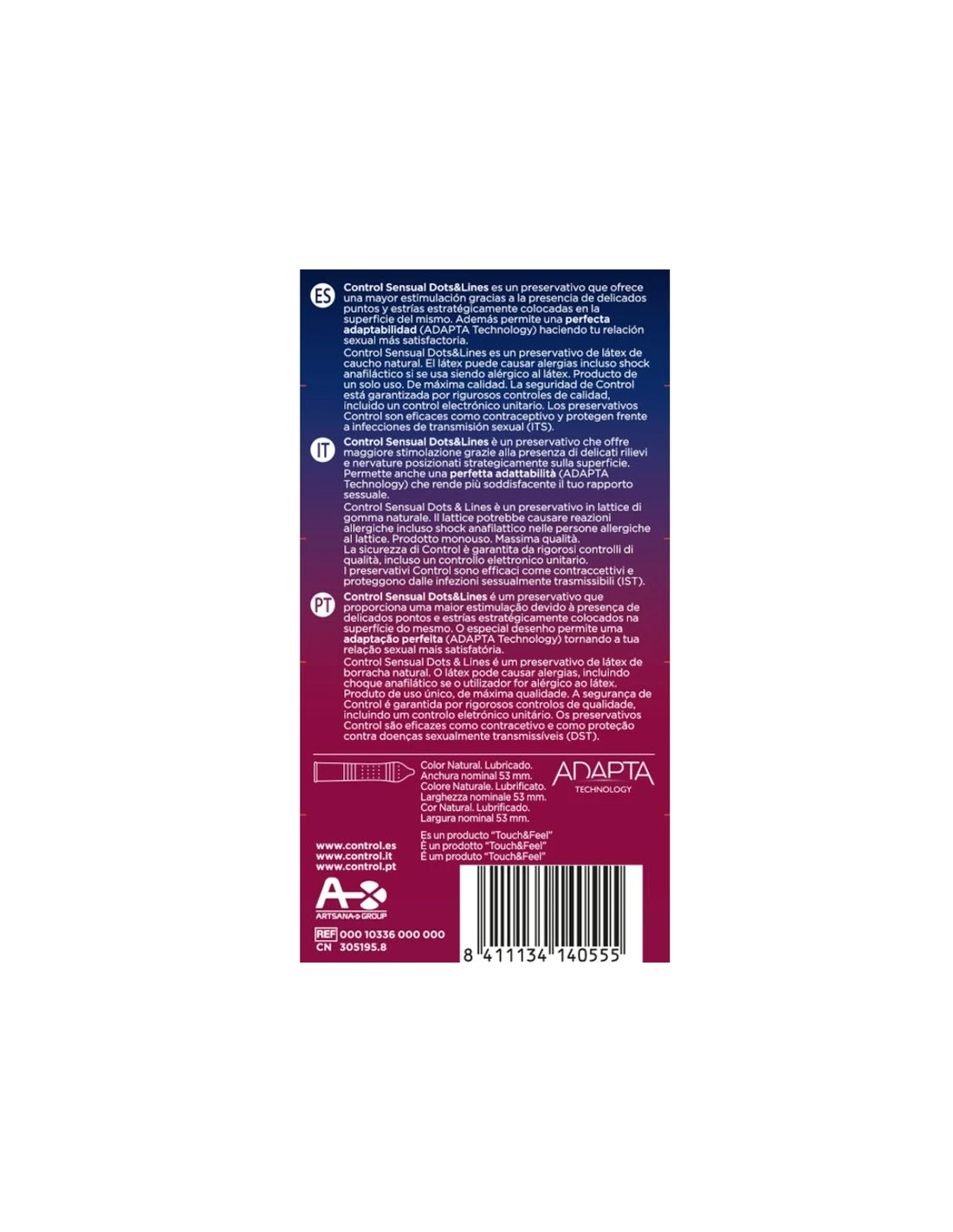 Control Sensual Dots&lines es un preservativo que ofrece una mayor estimulación gracias a la presencia de delicados puntos y estrías estratégicamente colocados en la superficie del mismo. Además permite una perfecta adaptabilidad (ADAPTA Technology), haciendo tu relación sexual más satisfactoria.