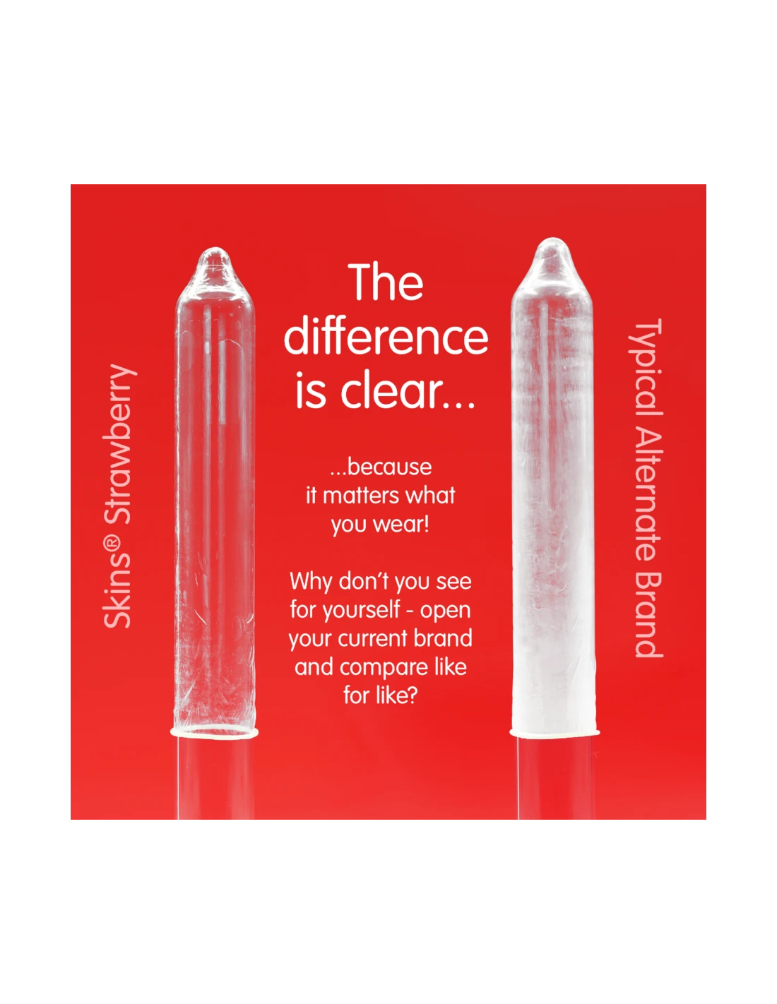 Presentamos nuestro nuevo pack de 8 con sabor a fresa, con un diseño elegante y listo para usar, y hasta un 33 % más de condones que el líder del mercado. Añade un clásico sabor afrutado a tu gama de productos con los condones Skins sabor fresa. Fabricados con látex natural de primera calidad para una sensación transparente y natural, estos condones están diseñados para brindar una sensación de segunda piel sin comprometer la resistencia ni la seguridad. Ideales para minoristas que buscan ofrecer una opción de sabor popular y confiable para una mayor intimidad y protección.