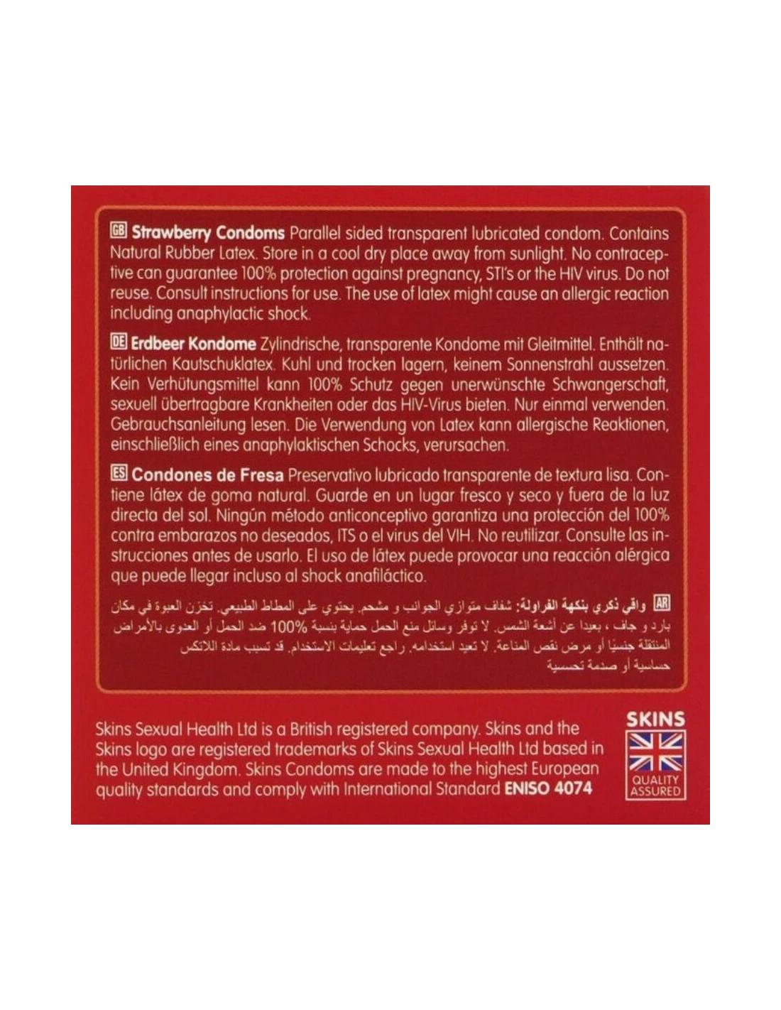 Presentamos nuestro nuevo pack de 4 con sabor a fresa, con un diseño elegante y listo para usar, y hasta un 33 % más de condones que el líder del mercado. Añade un clásico sabor afrutado a tu gama de productos con los condones Skins sabor fresa. Fabricados con látex natural de primera calidad para una sensación transparente y natural, estos condones están diseñados para brindar una sensación de segunda piel sin comprometer la resistencia ni la seguridad. Ideales para minoristas que buscan ofrecer una opción de sabor popular y confiable para una mayor intimidad y protección.