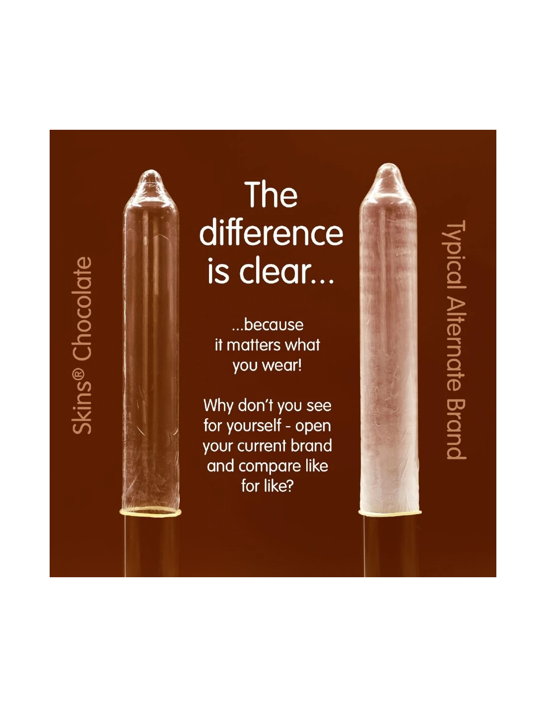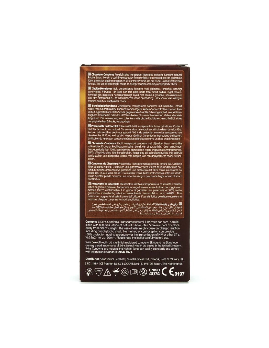 Presentamos nuestro nuevo paquete de 8 con sabor a chocolate, con un diseño elegante y listo para usar, y hasta un 33 % más de condones que el líder del mercado. Atrae a quienes buscan un producto íntimo divertido y de alta calidad con los condones Skins sabor chocolate. Estos condones envueltos individualmente combinan un sabor placentero con una protección superior, lo que los convierte en la opción ideal para tiendas de productos para adultos, farmacias y distribuidores de productos de bienestar. Estos condones Skins son una excelente manera de combinar dos amores: el sexo y el chocolate. Están lubricados y tienen un delicioso aroma a chocolate, realmente tentador, y además saben a chocolate. Como todos los condones Skins, están hechos de látex de alta calidad, dermatológicamente probado, que te brindará la protección que necesitas.