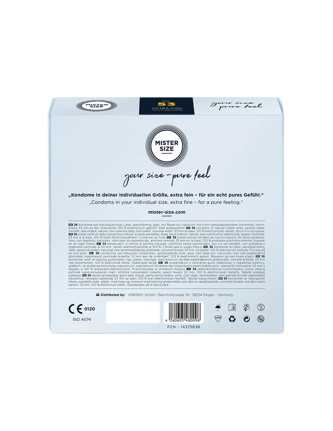 MISTER SIZE te brinda una sensación completamente nueva durante el sexo al mismo tiempo que ofrece una seguridad óptima. Todos nuestros preservativos MISTER SIZE cumplen con la norma DIN EN ISO 4074:2002 y están sujetos a pruebas minuciosas. Tener un preservativo con una seguridad óptima genera confianza y seguridad que les permite a ambos relajarse y dejarse llevar por completo durante el acto sexual.