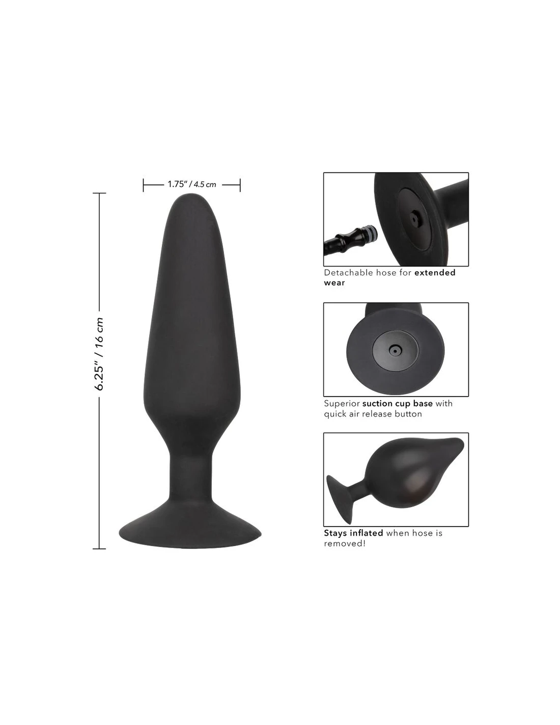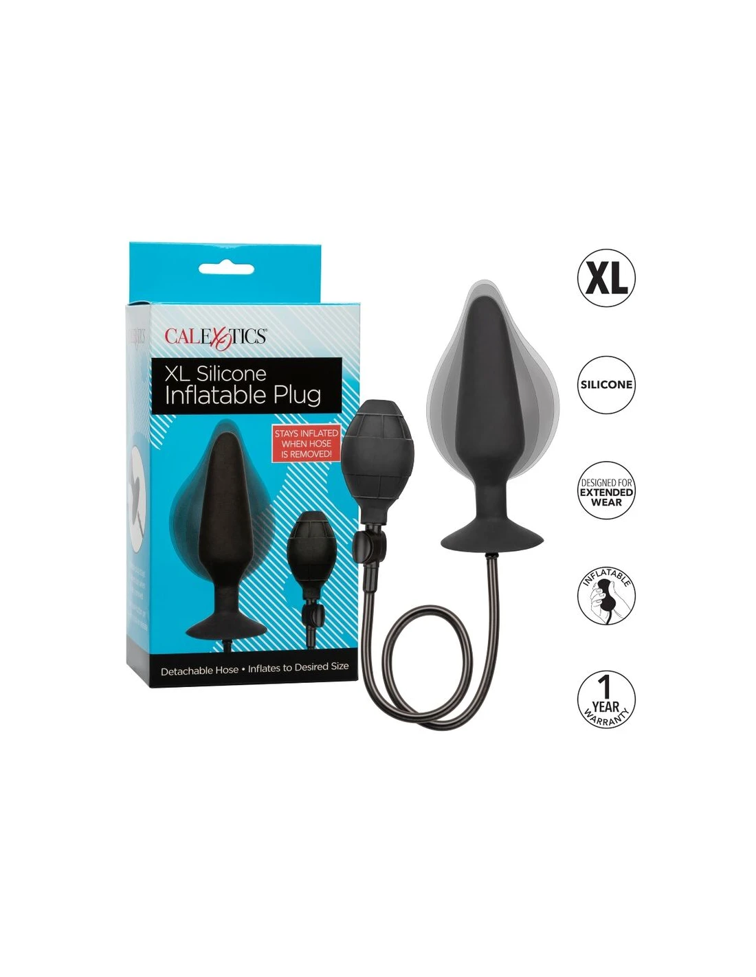 El plug anal inflable de silicona CalExotics XL es una sonda anal única en su tipo con cuerpo inflable, bulbo de fácil apriete y manguera desmontable. ¡La sonda incluso permanece inflada cuando se quita la manguera!