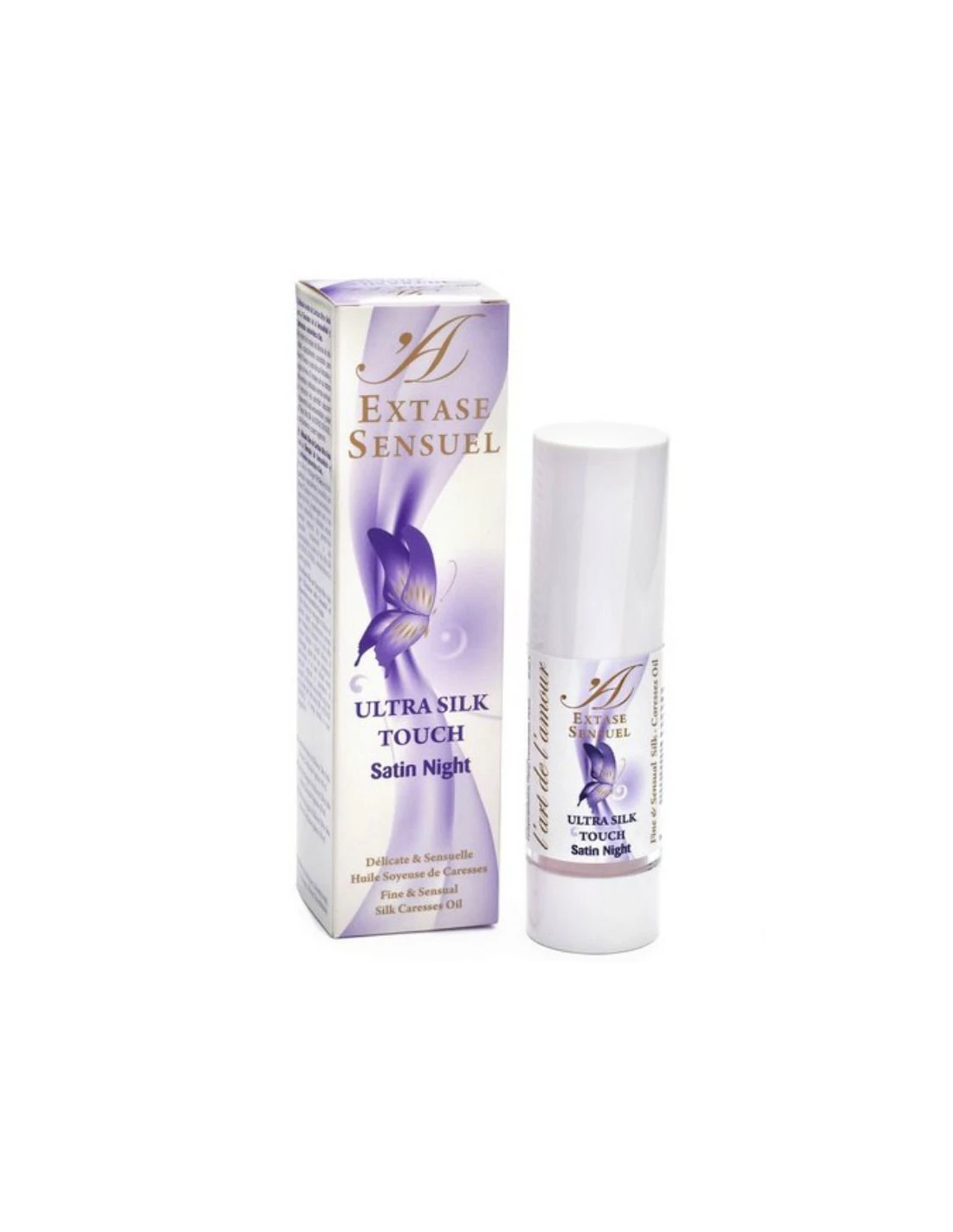 Fino aceite de masaje de silicona de alta calidad, especialmente concebido para elevar el deseo y vuelo de sus fantasías y juegos de amor. El masaje con su textura ultra sedosa y delicados aromas sensuales nocturnos, les permitirá descubrir mutuamente la alta sensorialidad y poder del tacto Ultra Silk de Extase Sensuel, extra durarero y super sugerente.