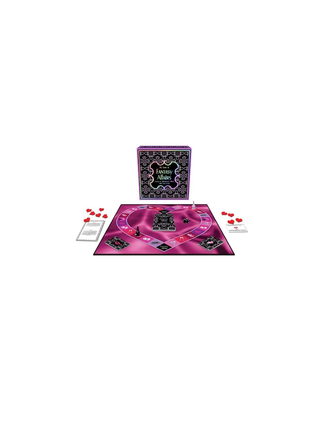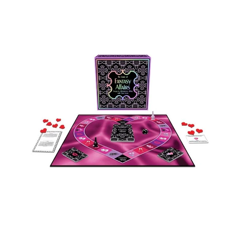 Fantasy Affairs es un juego de mesa que reúne varios escenarios para tus fantasias. Tal vez quieras convertirte en la ama de casa que sueña con seducir a su fontanero, o el jefe de un club privado de striptease muy interesado en tener una actuación privada.