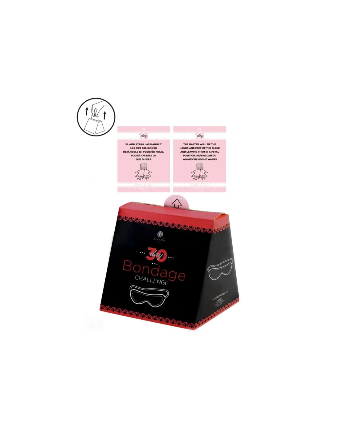 ppDiviertete con estos atrevidos retos con los que podras experimentar y descubrir nuevas experiencias adentrandote en el mundo del bondage ppEn estas cartas la intensidad de las pruebas va incrementando conforme van pasando los dias comenzando el dia 1 con pruebas mas suaves hasta llegar al maximo de excitacion el ultimo dia ppEs importante antes del comienzo del challenge tener en cuenta unas normas basicas pulliEs importante que antes de jugar se hablen las condiciones de cada jugador estableciendo cada uno sus limites liliLos jugadores deben elegir una palabra de seguridad que diran cuando quieran parar alguna de las acciones que se realizan en cada uno de los 30 dias liliSe recomienda que ambos participantes mantengan gran confianza entre ellos liliDebe haber un rol amo y otro sumiso que podran ir alternandose durante los 30 dias liliNunca hay que atar nada alrededor del cuello liliNo se debe atar fuerte liliDebe jugarse con unas tijeras de punta redonda al alcance por si el sumiso se siente agobiado liliLas pruebas iran aumentando de intensidad a medida que vayan avanzando los dias lili30 tarjetas lili110 x 110 mm liliIdioma Espanol e ingles p pp pp p p