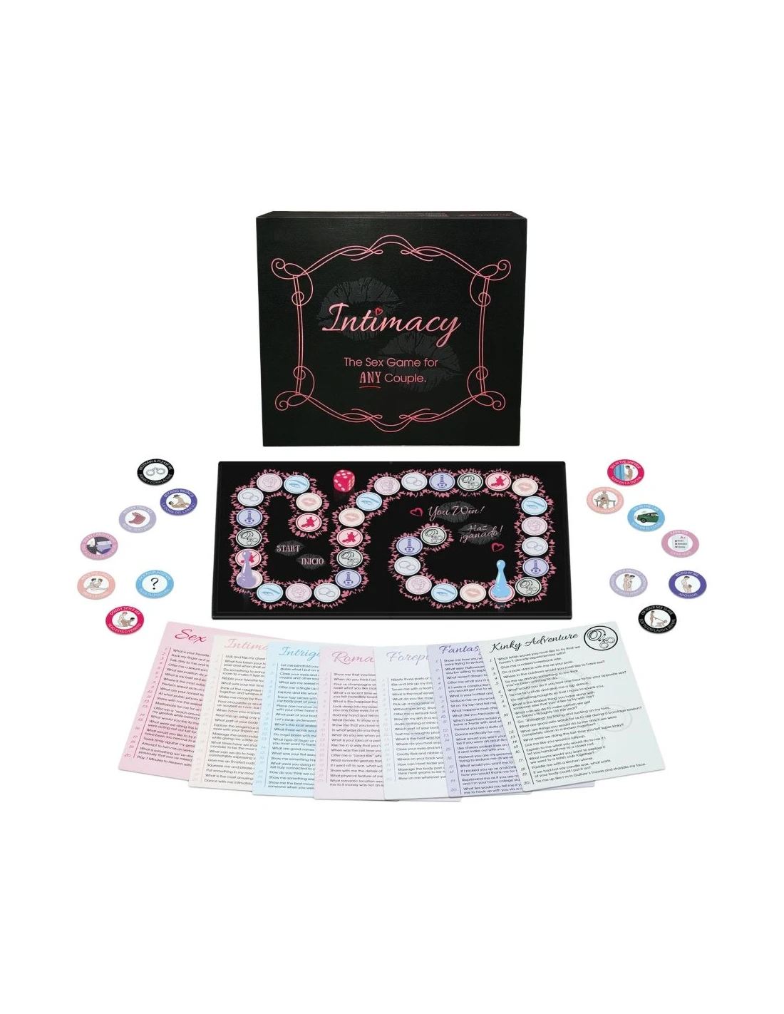 - Incluye: Un tablero de juego, 1 dado, 2 fichas, 14 monedas de recompensa sexual y 2 cartas de preguntas para cada una de las 7 categorías: Sexo, Intimidad, Intriga, Romance, Juegos previos, Fantasía y Kinky Adventures.