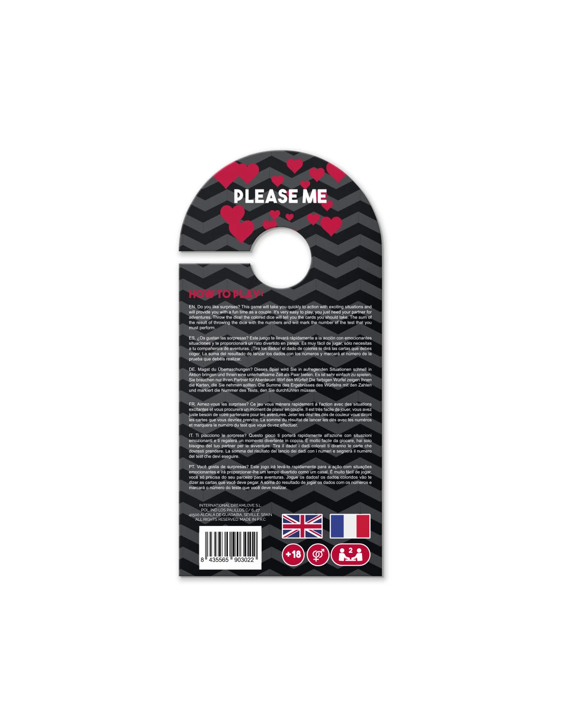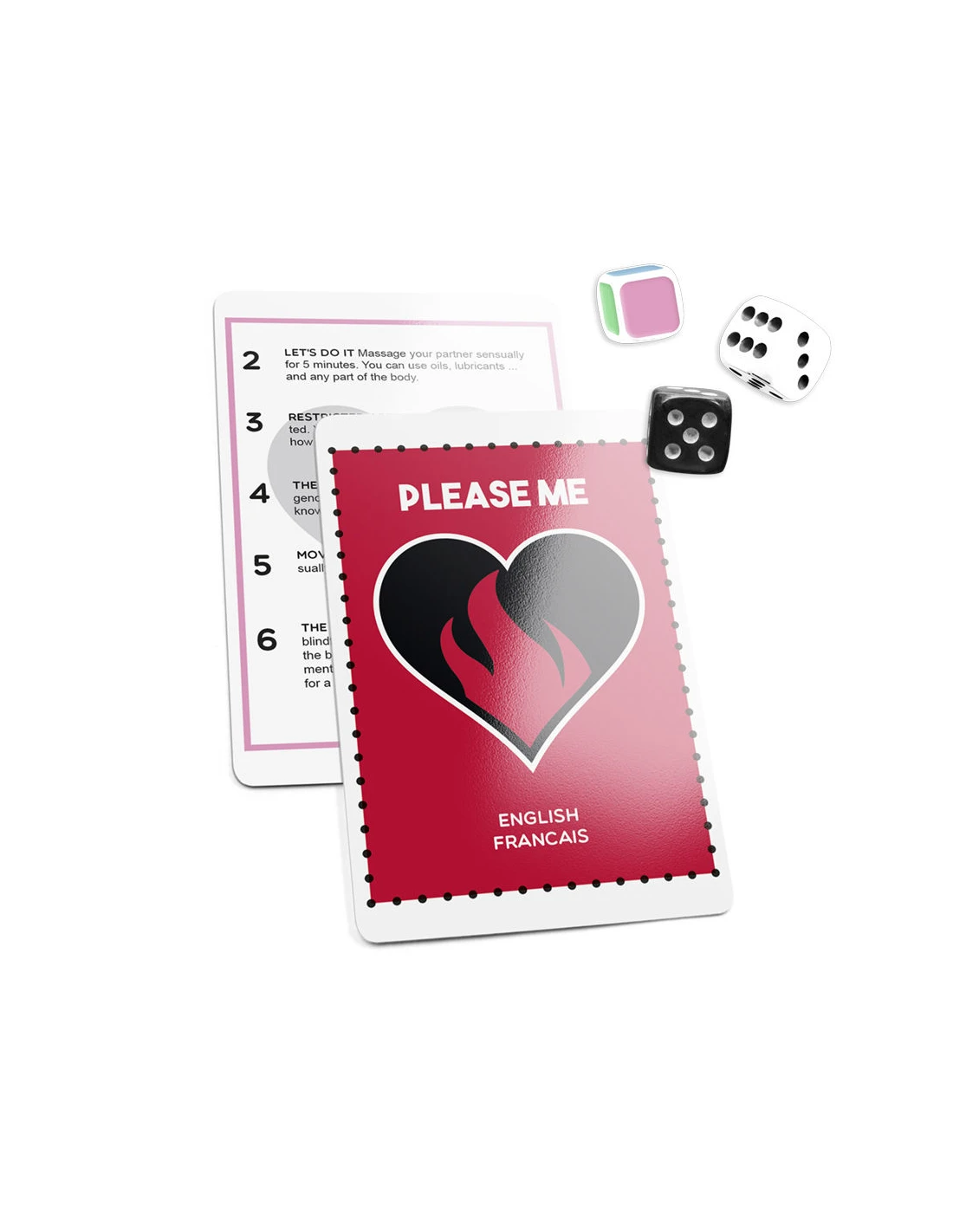 ¿Os gustan las sorpresas? Este juego te llevará rápidamente a la acción con emocionantes situaciones y te proporcionará un rato divertido en pareja. Es muy fácil de jugar, solo necesitas a tu compañero de aventuras. ¡Tira los dados! El dado de colores te dirá las cartas que debes coger. La suma de resultado de lanzar los dados con los números y marcará el numero de la prueba que debéis lanzar.