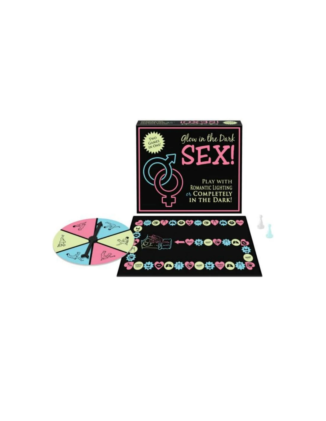 ¡Hora de divertirse porque son dos juegos en uno! Puedes llevar a a cabo los preliminares en torno al tablero y debes hacerlo antes de que la luz se vaya. Además las acciones para preliminares cambian si estás jugando a oscuras o con luz. La primera persona que llegue al final, consigue una posición sexual. ¡Jugar en la oscuridad nunca ha sido tan divertido!