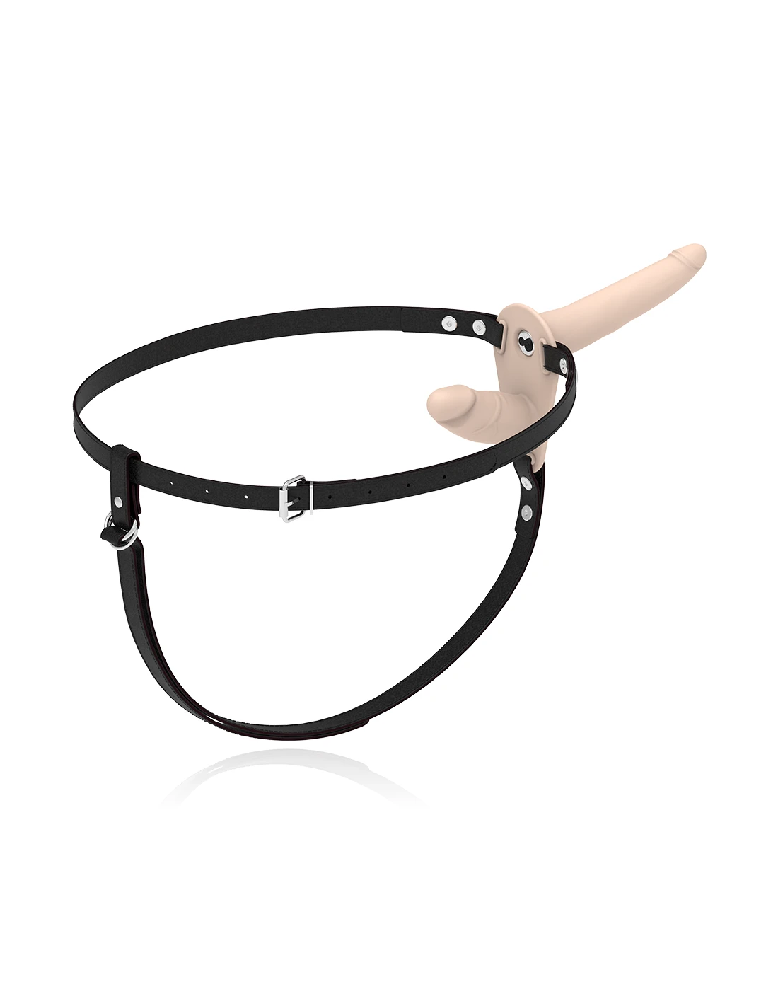 Arnés doble penetración ajustable a cualquier talla de cadera, incluso las más grandes. El dildo está fabricado en silicona de primera calidad.