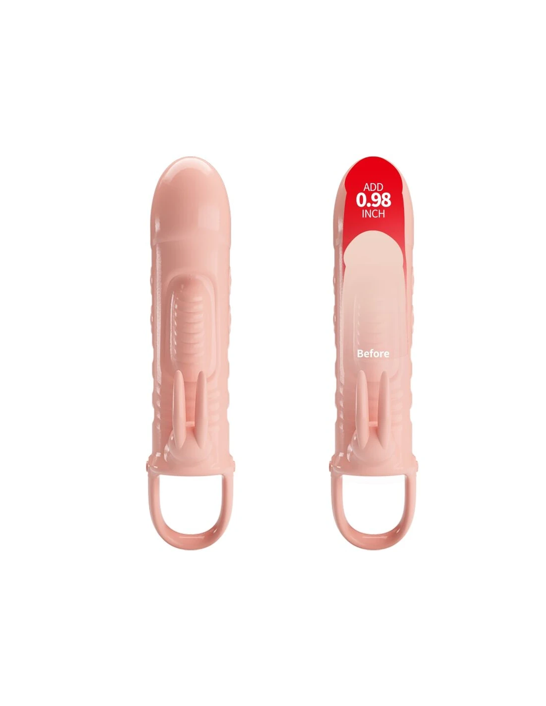 Diviértete en serio y sexy con esta funda vibradora para pene de conejo. Esta funda para pene que mejora la erección y promete placer está hecha de TPR suave y está asegurada en su lugar por un lazo de bola. Un vibrador en la punta extiende la longitud de su pene y se activa al contacto. Estimulando la cabeza de su eje, también proporciona estimulación interna para ella. Llévala a la felicidad climática encendiendo el conejo para enviar vibraciones directamente a su clítoris. La funda elástica envuelve su pene para una erección más fuerte y duradera, ¡lo que le da más tiempo para disfrutar de las vibraciones!