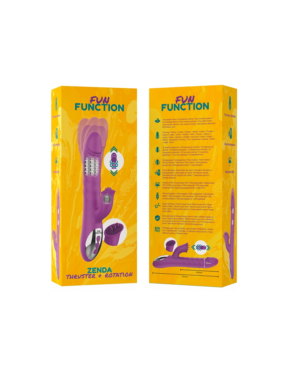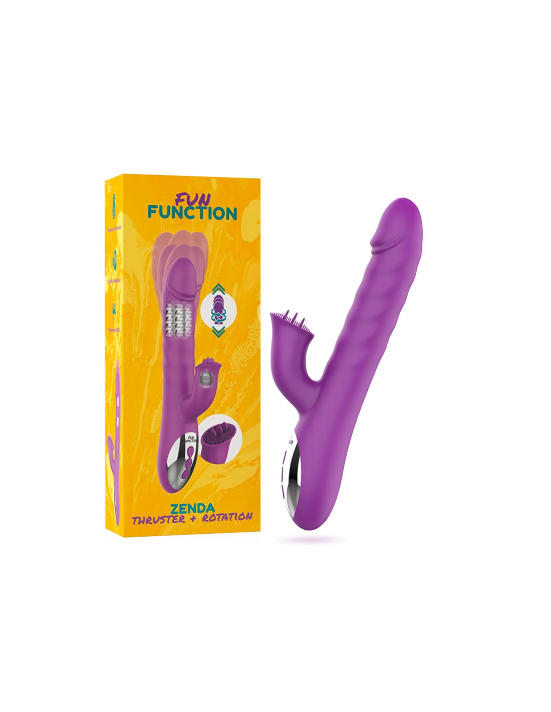 La gama ZENDA THRUSTER & ROTATION incorpora un conjunto de funciones nunca antes visto: estimulación del punto G gracias a su base de suaves perlas giratorias, penetración mediante la asombrosa función “up & down“ y estimulación del clítoris gracias a su increíble "rabbit".