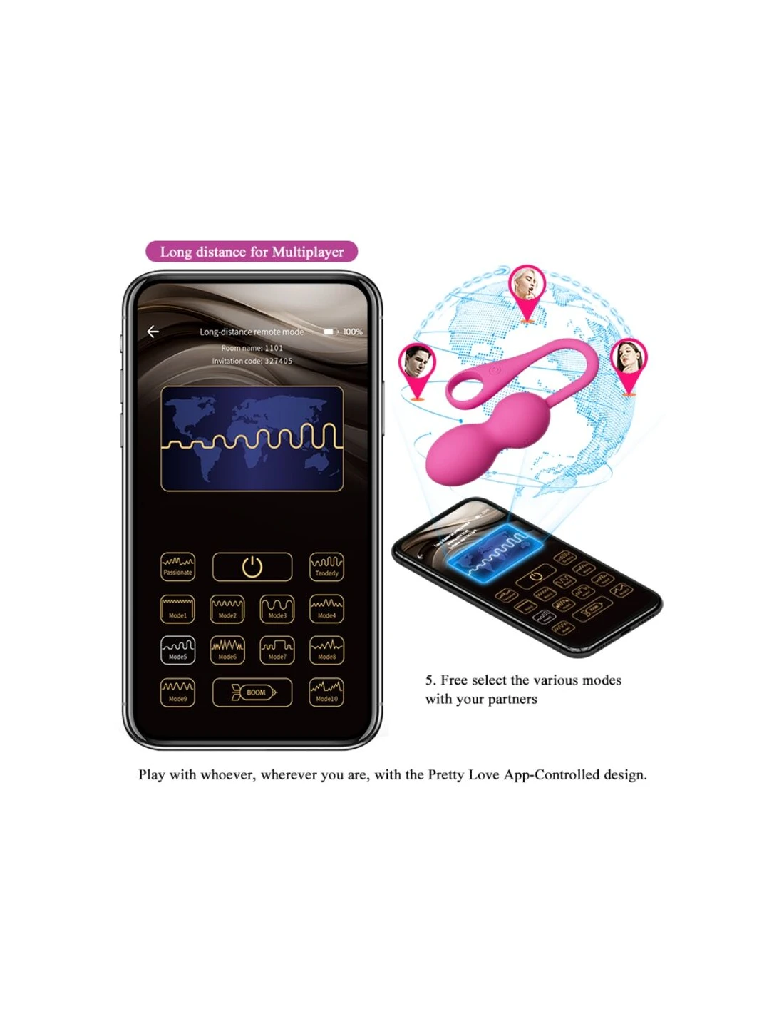 Entrena, tonifica y aprieta tu vagina, y diviértete durante días haciéndolo con las bolas de Kegel vibradoras Pretty Love de 12 funciones. Permítete a ti mismo, o incluso a tu pareja, experimentar y controlar las 12 funciones de vibración que incluyen una gama de velocidades y patrones para sensaciones internas intensas. Descubre y utiliza cualquiera de los 12 modos preestablecidos, o crea el tuyo propio con la aplicación gratuita controlada por teléfono móvil. Dale a tus músculos de Kegel el entrenamiento y el placer que se merecen con bolas de Kegel intercambiables y vibrantes.