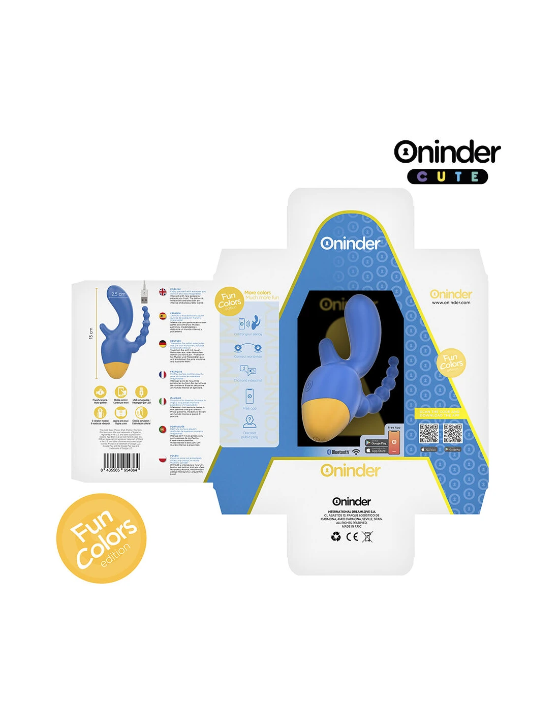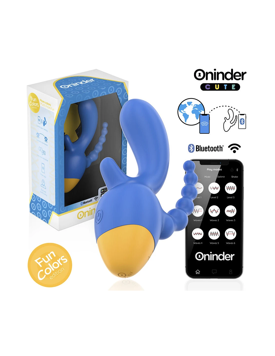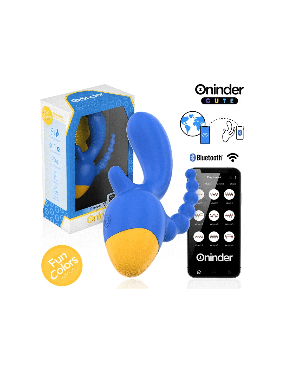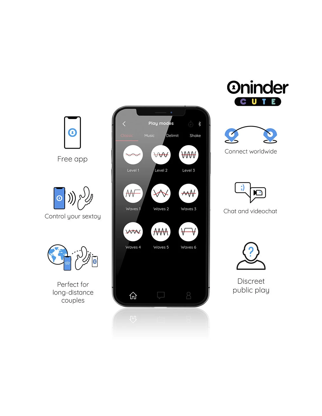 Con este vibrador no solamente puedes elegir entre combinaciones de intensidad y vibraciones preestablecidas, sino que también puedes compartir a un innovador control basado en una aplicación. Simplemente tienes que descargar la aplicación gratuita ONINDER™ en tu dispositivo Android o iOS y conectar tu smartphone o Tablet.