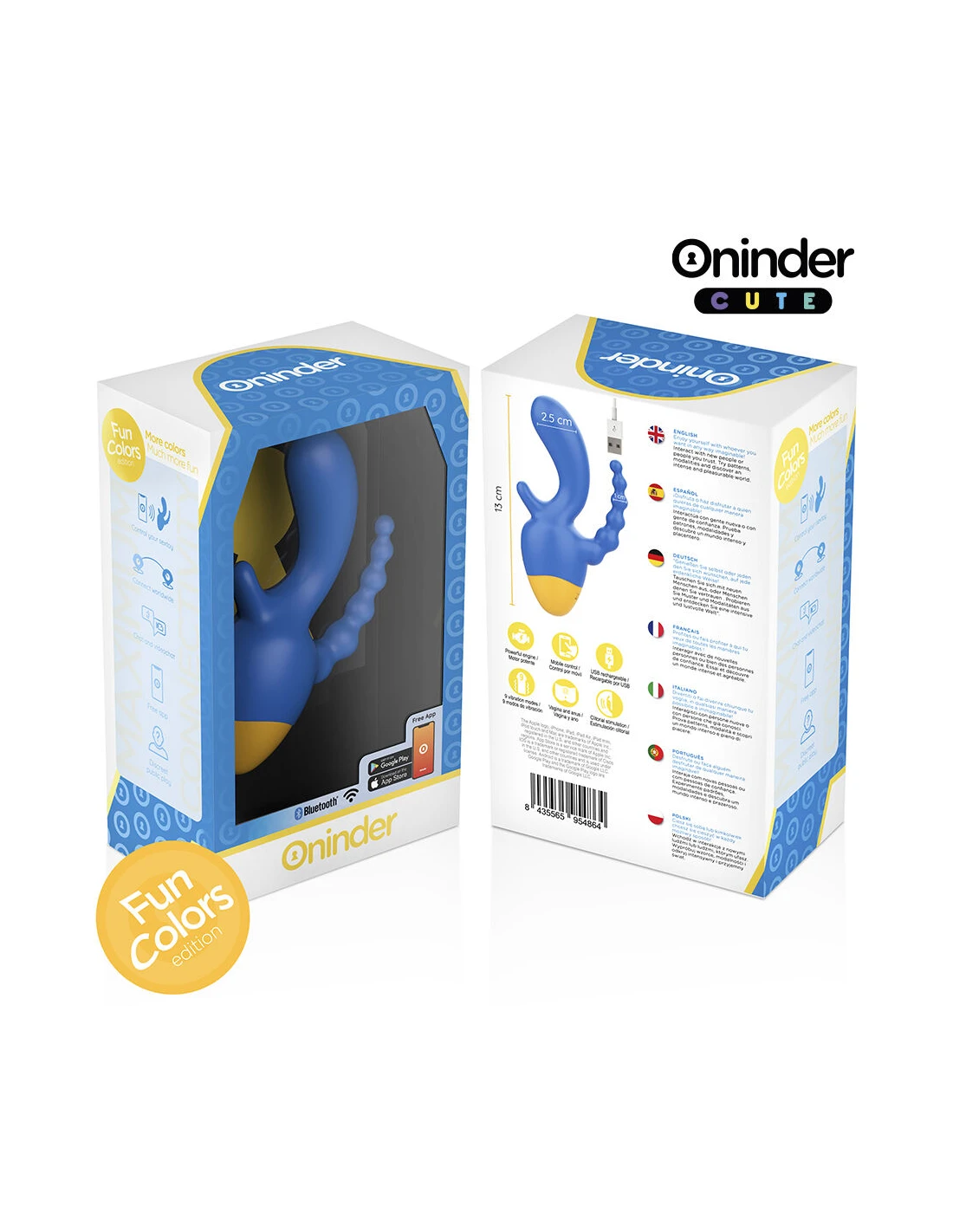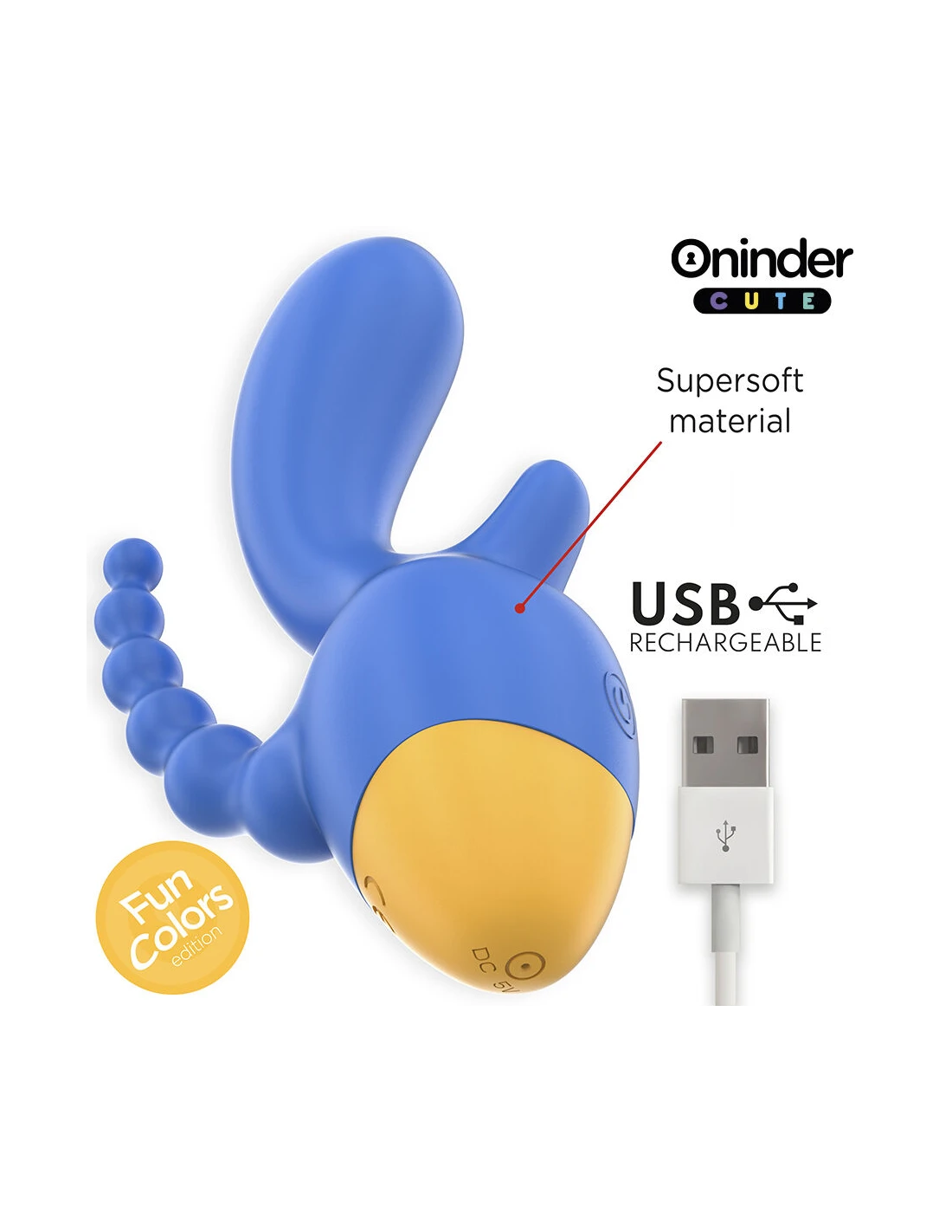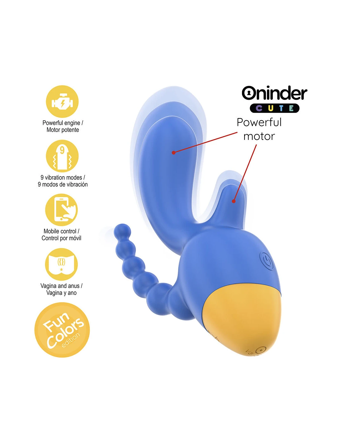 Explora un mundo de sensaciones con el vibrador de la colección ONINDER CUTE, diseñado para quienes buscan una estimulación completa y precisa. Con su vibrante combinación de azul oscuro y base amarilla, este vibrador ofrece doble estimulación, proporcionando placer tanto al clítoris como a la zona anal, en un diseño ergonómico y cómodo.