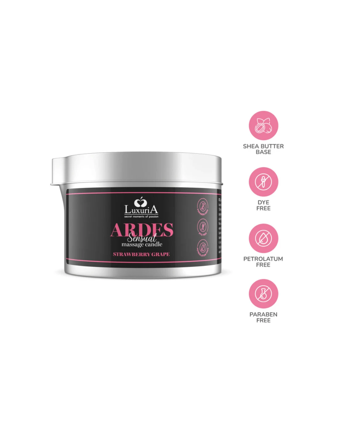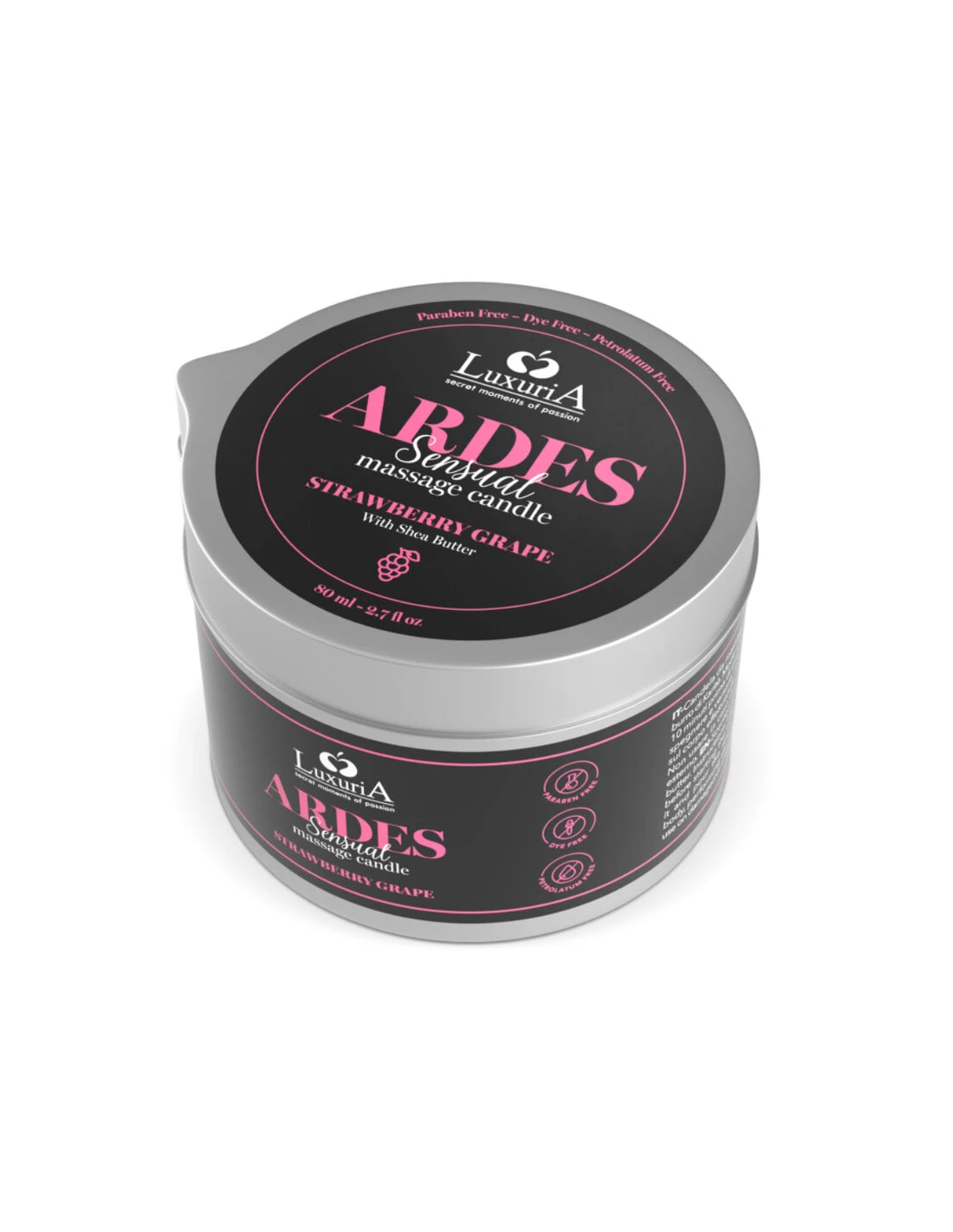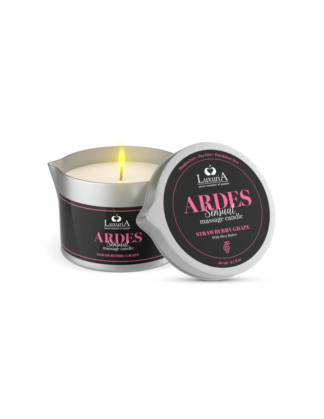 Luxuria Ardes Vela De Masaje Uva/ Fresa es una vela de masaje aromatizada, elaborada con manteca de karité, enriquecida con aromas sensuales para intensificar y estimular la relación íntima. Las propiedades reafirmantes y emolientes de la manteca de karité proporcionarán a tu piel alivio y suavidad. El embriagador aroma de sus fragancias te envolverá en cálidos y sensuales momentos llenos de pasión y excitación. Ardes encenderá una atmósfera lujuriosa llevándote a una dimensión sensorial del placer erótico.