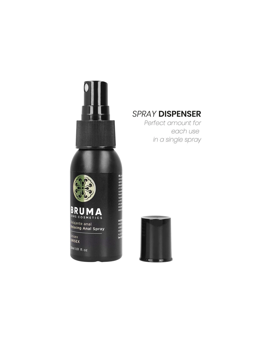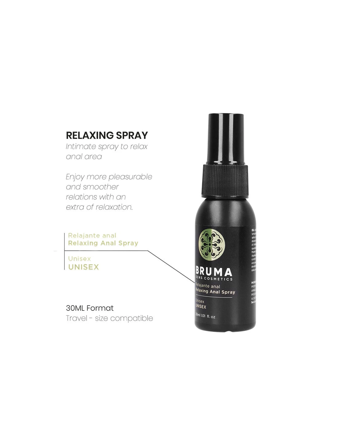 - Spray anal relajante: Formulado para relajar los músculos de la zona anal, este spray facilita la comodidad y reduce la tensión, proporcionando una experiencia más placentera y libre de molestias. Perfecto para quienes buscan mejorar su confort durante las relaciones anales, el spray de BRUMA es ideal para suavizar y preparar la zona, asegurando una experiencia más agradable.
