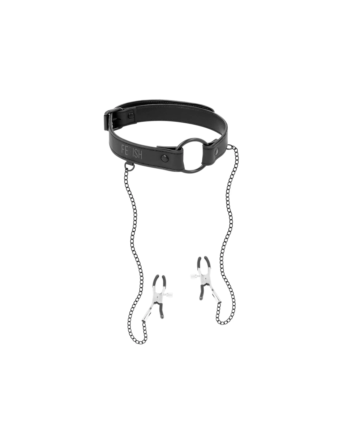 FETISH SUBMISIVE mordaza con anilla de cuero vegano con pinza para pezones unido por cadena metal. ( Anilla fabricada en pvc )