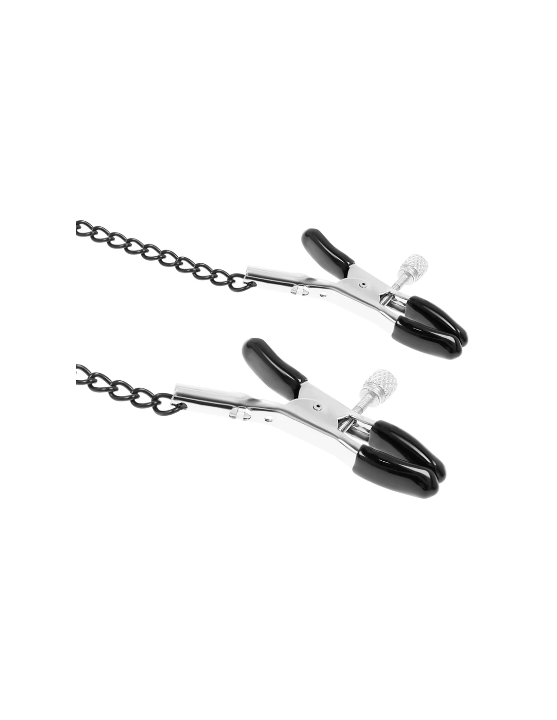Fabricado de suave cuero vegano y acabado con dos pinzas para pezones con cadenas, este set de collar con pinzas te asegura a tu sujeto al momento. La comoda mordazase ajusta fácilmente a casi todas las tallas, mientras que las pinzas para pezones te ofrecen justo la tensión adecuada en el lugar adecuado. Simplemente ajusta el tornillo a los pezones hasta que quede ajustado y confortable y empieza a disfrutar de placer de un buen pellizco. Sus recubrimientos de goma permitirán que con la acción del momento no se deslicen y permanezcan en su lugar.