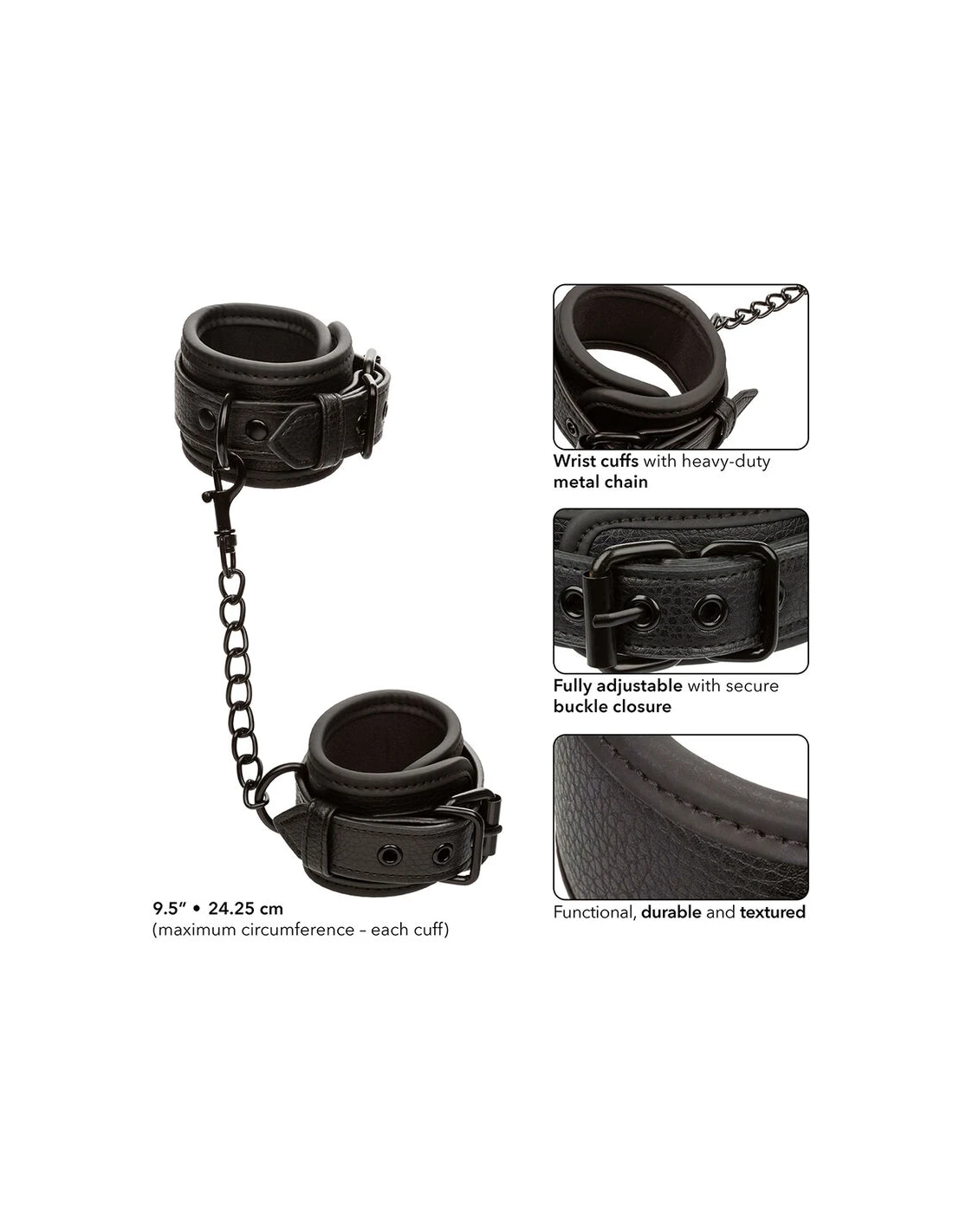 - Esposas totalmente ajustables con cierre de hebilla seguro