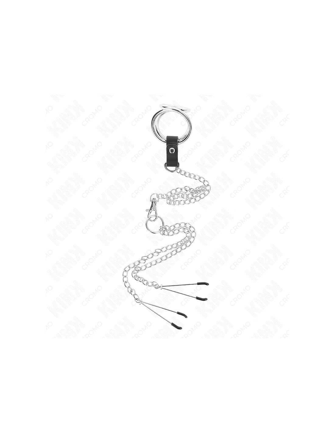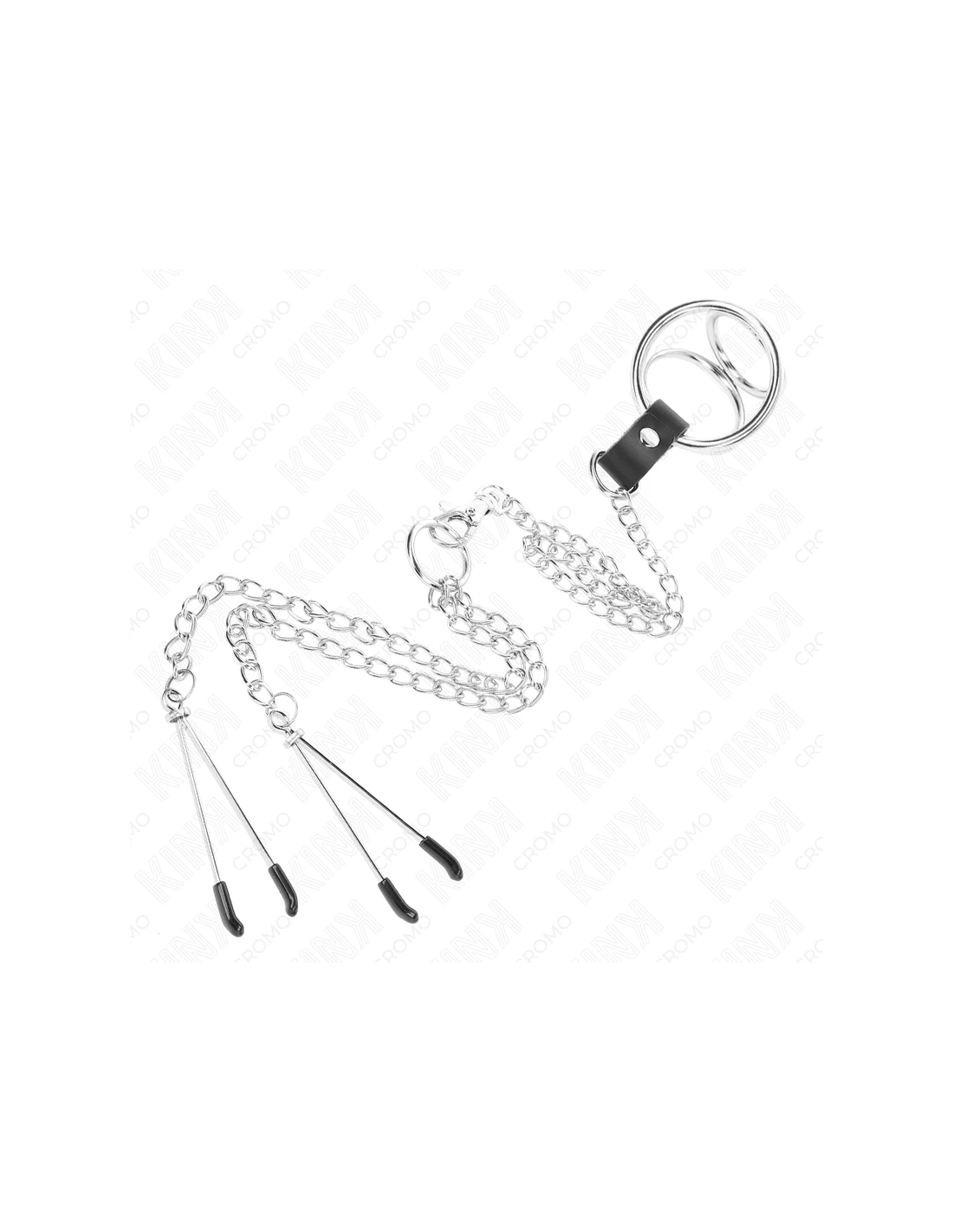 KINK - ANILLO PENE TRIPLE METAL CROMADO 3 CM A 4.5 CM CON CADENA METAL 26 CM Y PINZAS PARA PEZONES