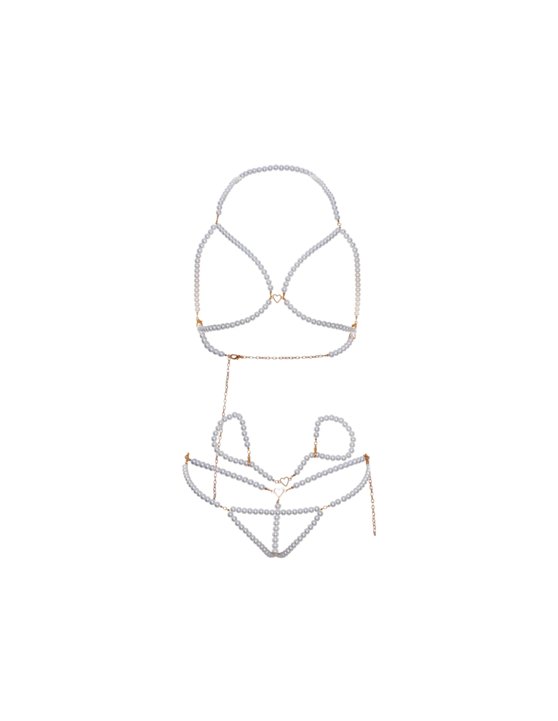 Mímate con nuestro seductor conjunto de lencería de 3 piezas confeccionado en perlas de imitación, que presenta un sujetador de copa abierta y un cordón con cierres de cadena ajustables. El conjunto está adornado con sensuales detalles en forma de corazón, que añaden un toque de romance a tus momentos íntimos. Para completar la emoción, se incluyen muñequeras a juego. Este conjunto es perfecto para quienes buscan estilo y emoción. Siéntete segura e irresistible con esta exquisita lencería.