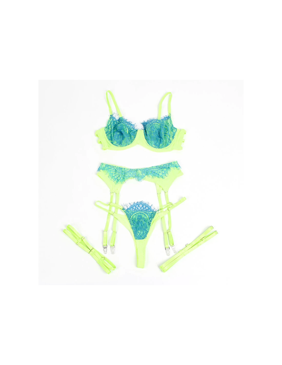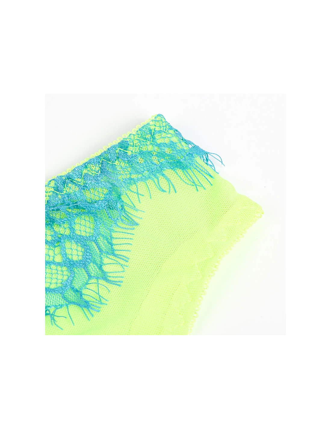 El encaje de pestañas, conocido por su aspecto refinado y romántico, añade un toque femenino y etéreo al conjunto. Su color verde, sofisticado y poco convencional, aporta frescura y modernidad, haciéndolo perfecto para destacar en cualquier ocasión especial o para disfrutar de momentos íntimos.
